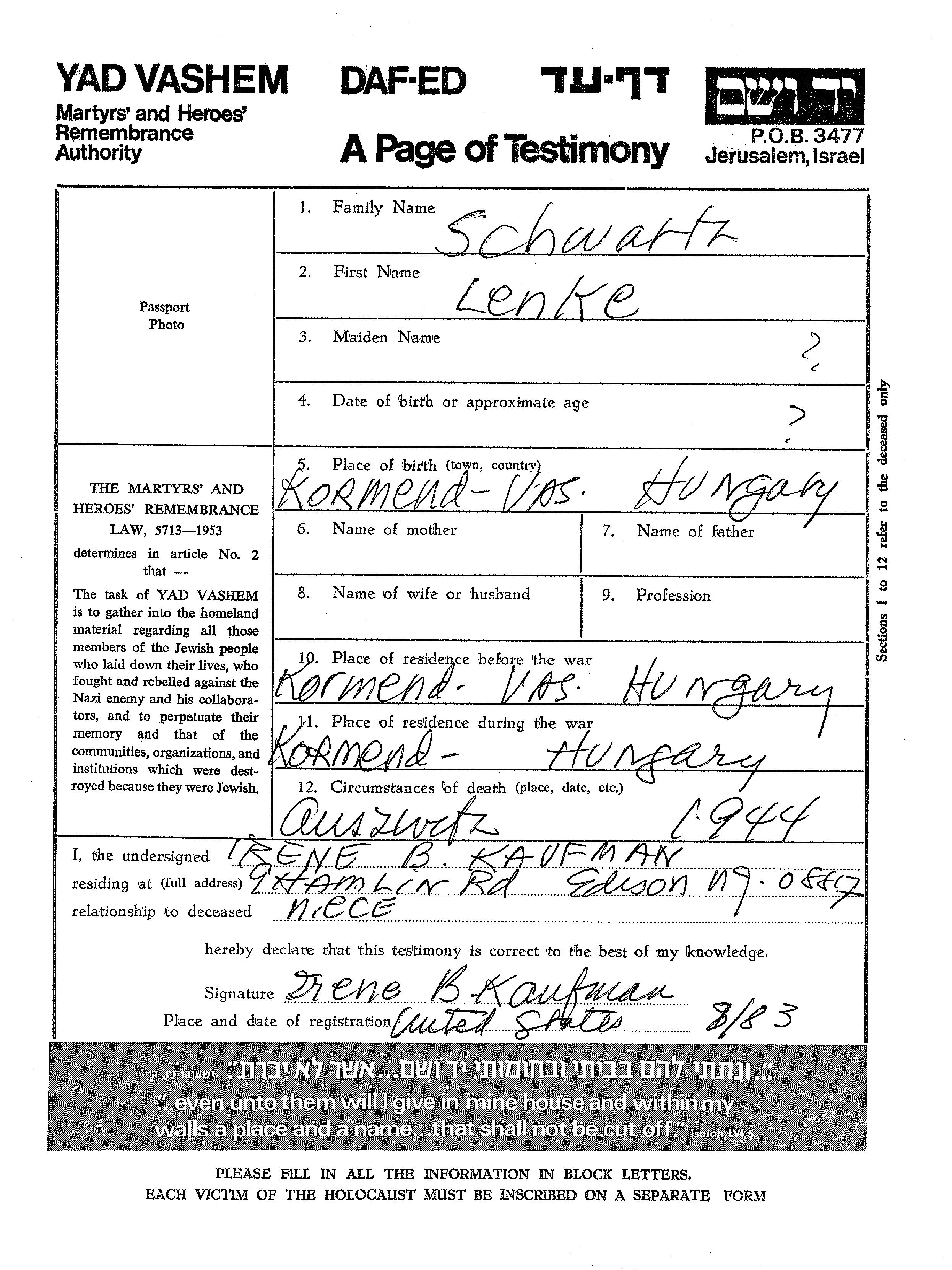 Lenke Schwartz wurde in Kormend, Ungarn geboren. Vor dem Zweiten Weltkrieg lebte sie in Kormend, Ungarn. Während des Krieges war sie in Kormend, Ungarn.