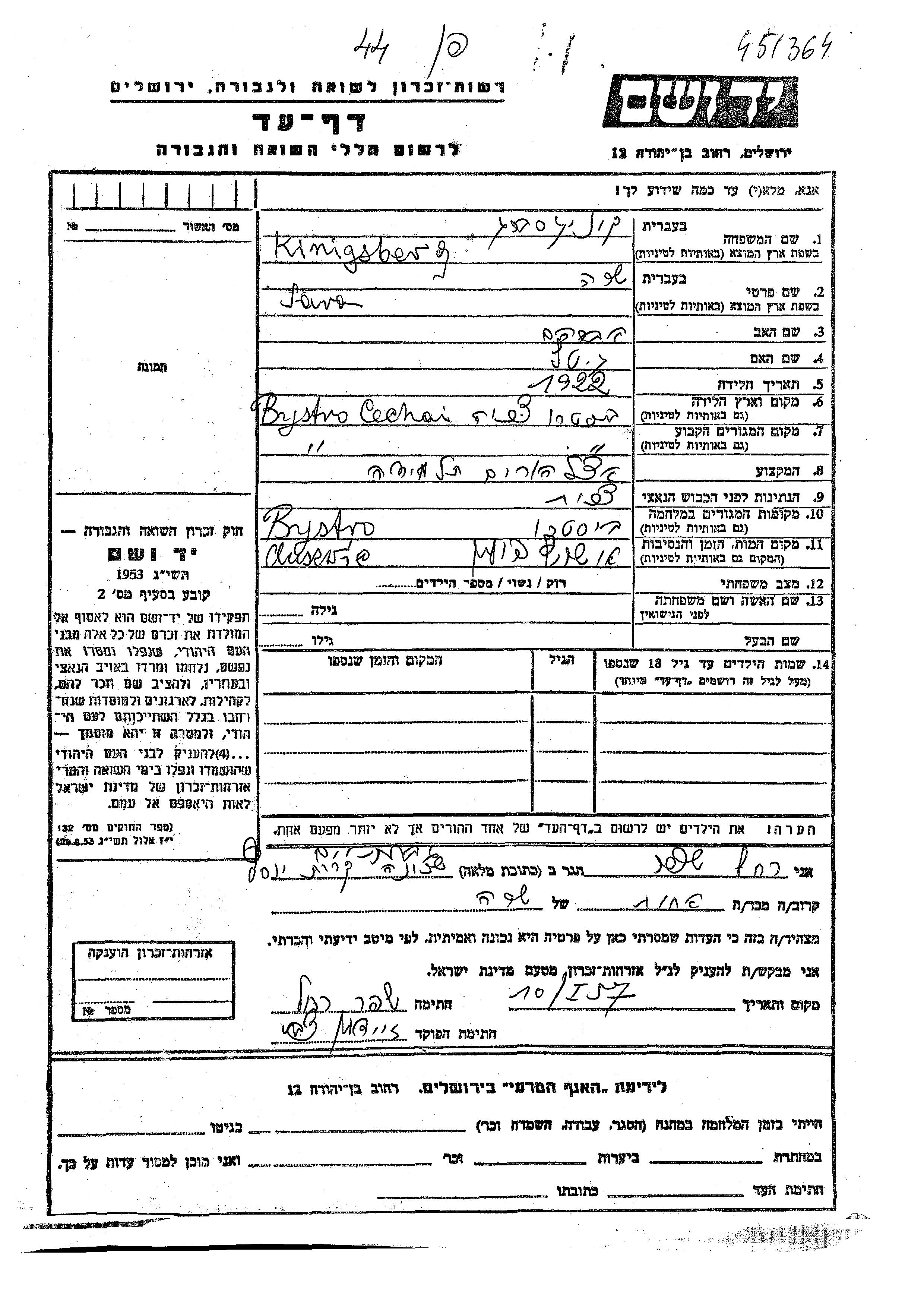 Sara Kinigsberg wurde im Jahr 1922 in Bystra, Tschechoslowakei geboren. Sie war die Tochter von Avraham und Gitel. Sie war Schüler/-in. Vor dem Zweiten Weltkrieg lebte sie in Bystra, Tschechoslowakei. Während des Krieges war sie in Bystra, Tschechoslowakei.