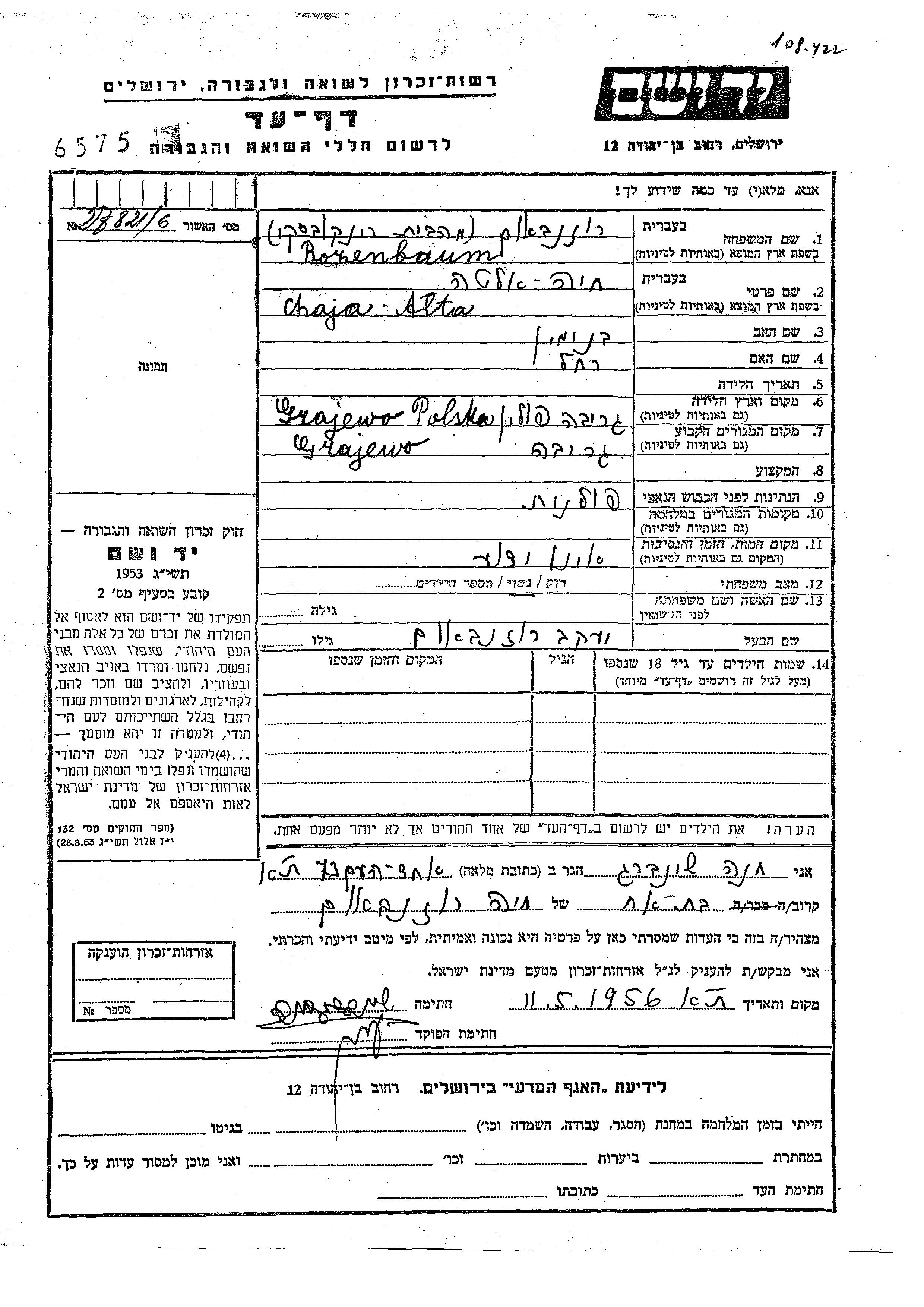 Chaja Alta Rozenbaum, geb. Rinkovski wurde in Grajewo, Polen geboren. Sie war die Tochter von Beniamin und Rakhel. Sie war mit Yaakov Verheiratet. Vor dem Zweiten Weltkrieg lebte sie in Grajewo, Polen.