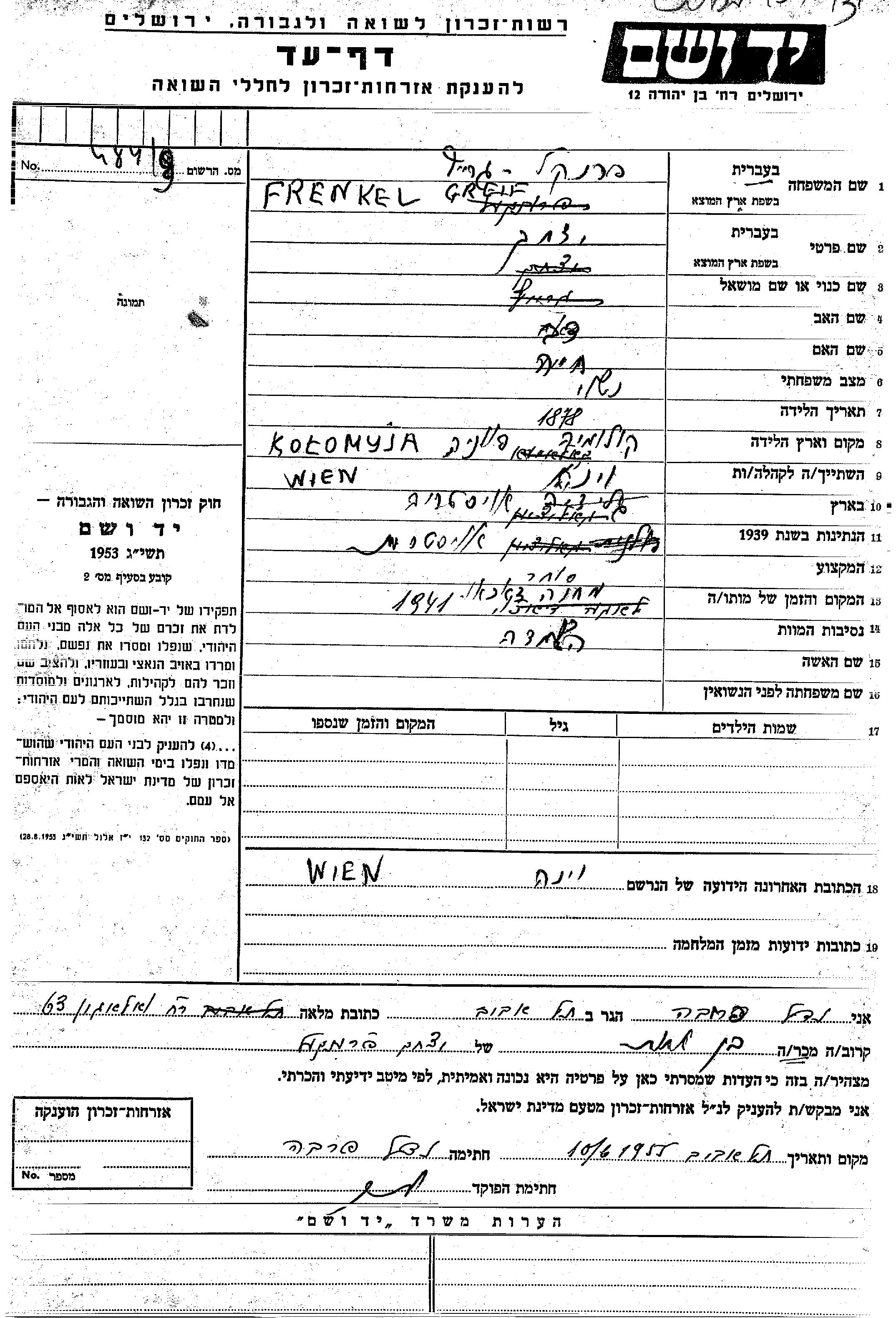 Yitzkhak Frenkel Greif wurde im Jahr 1878 in Kolomyja, Polen geboren. Er war der Sohn von Dov Zeev und Khaia. Er war Kaufmann/-frau und Verheiratet. Vor dem Zweiten Weltkrieg lebte er in Wien, Österreich.