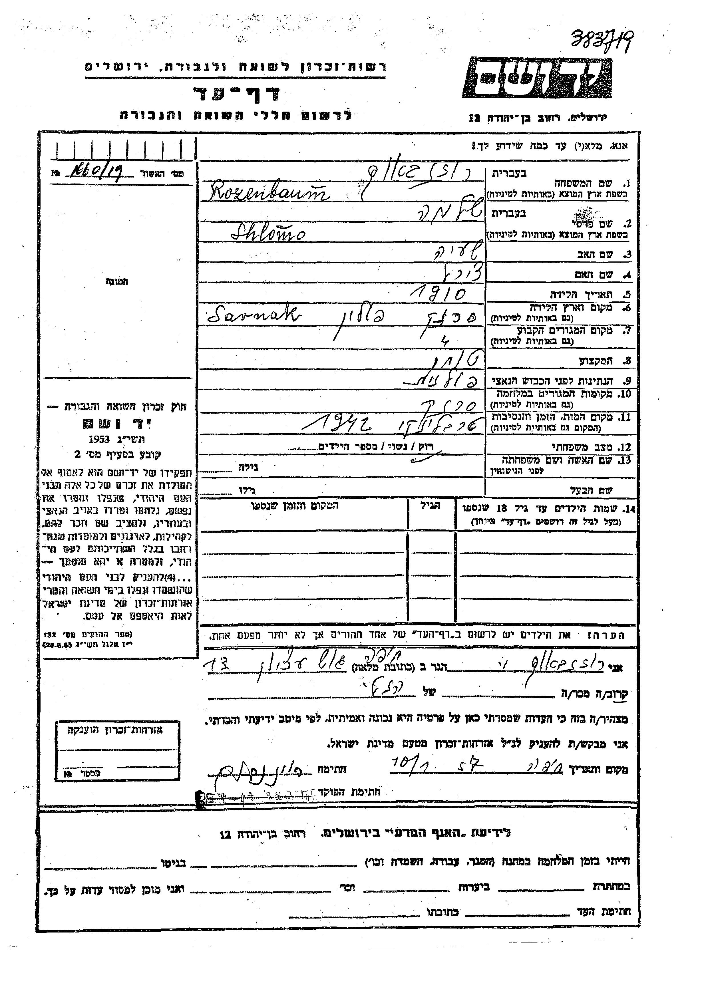 Rozenbaum Shlomo 1910 Sarnak, Polen Gedenkblatt