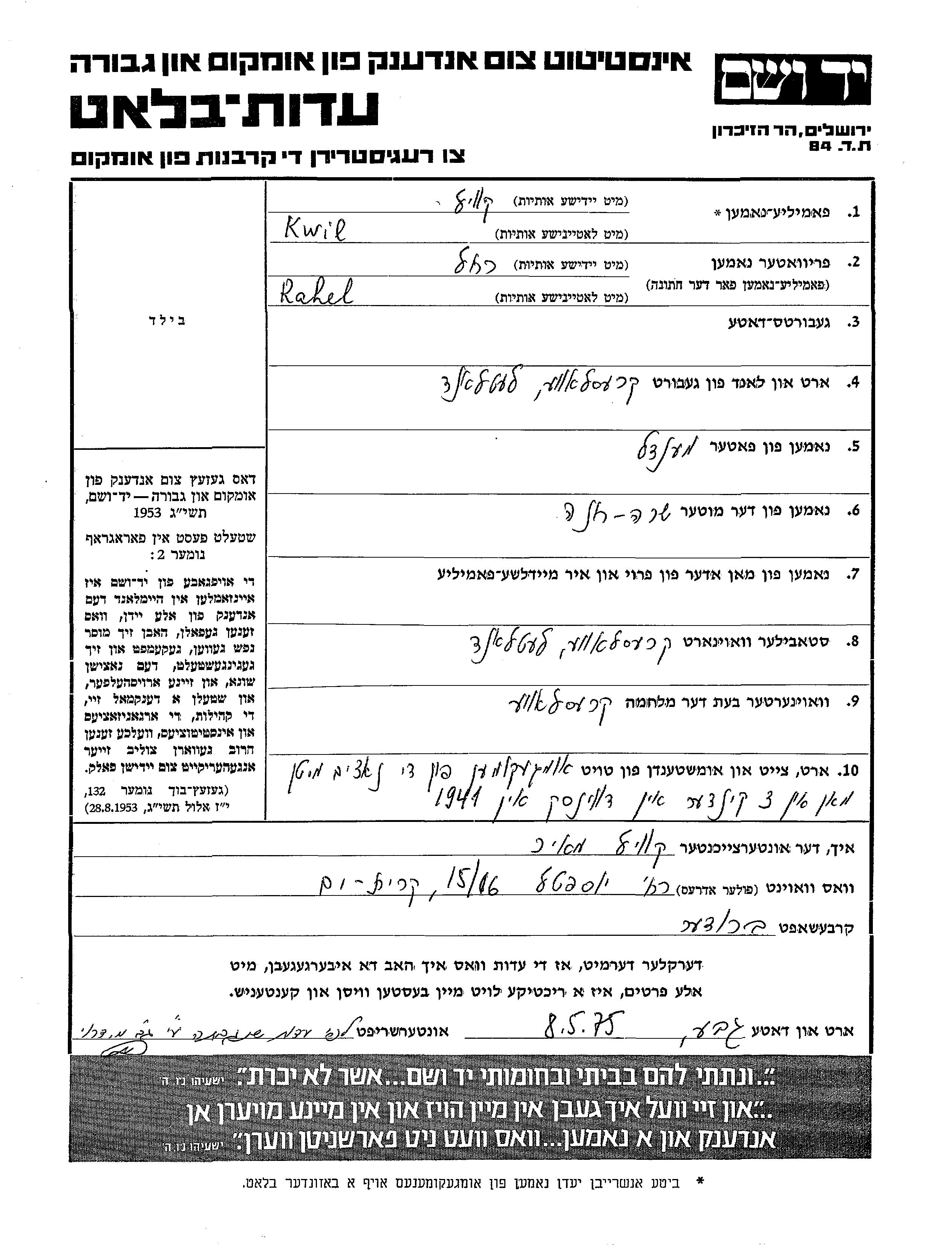 Rahel wurde in der Schoah ermordet. Todesort: Dvinsk, Lettland im Jahr 1941.