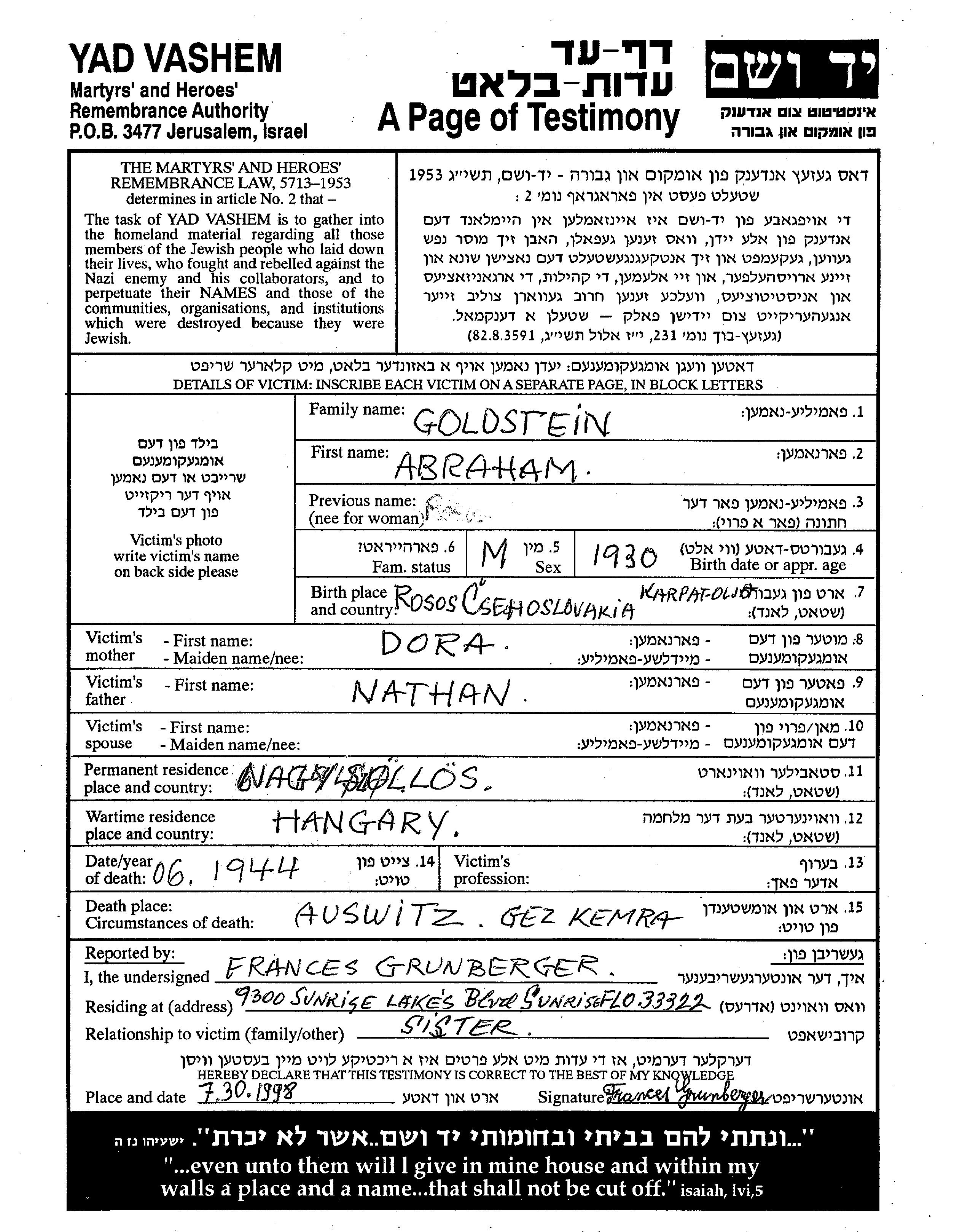 Goldstein Abraham 1930 Nagiszollos, Tschechoslowakei Gedenkblatt
