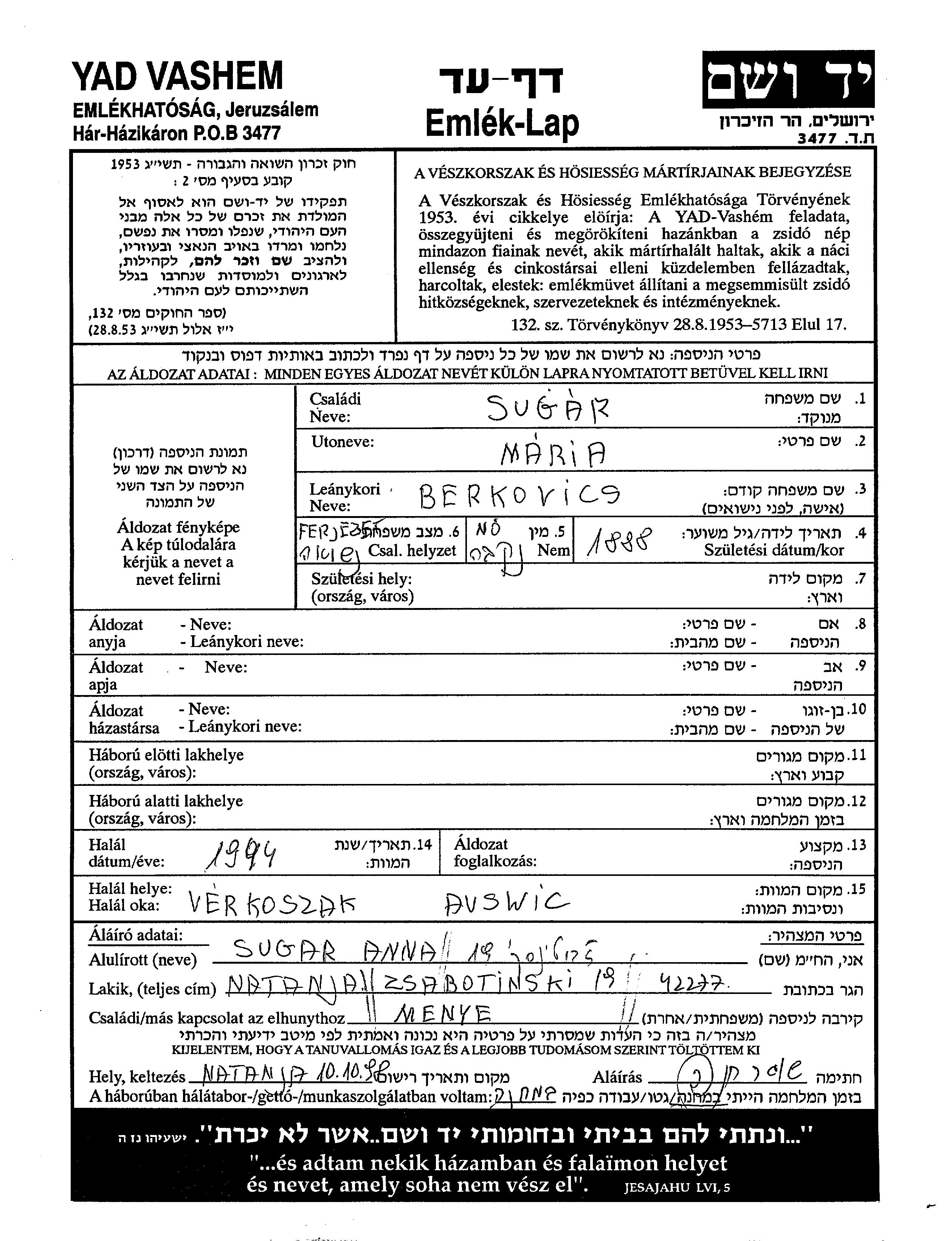 Maria wurde in der Schoah ermordet. Todesort: Auschwitz, Polen im Jahr 1944.