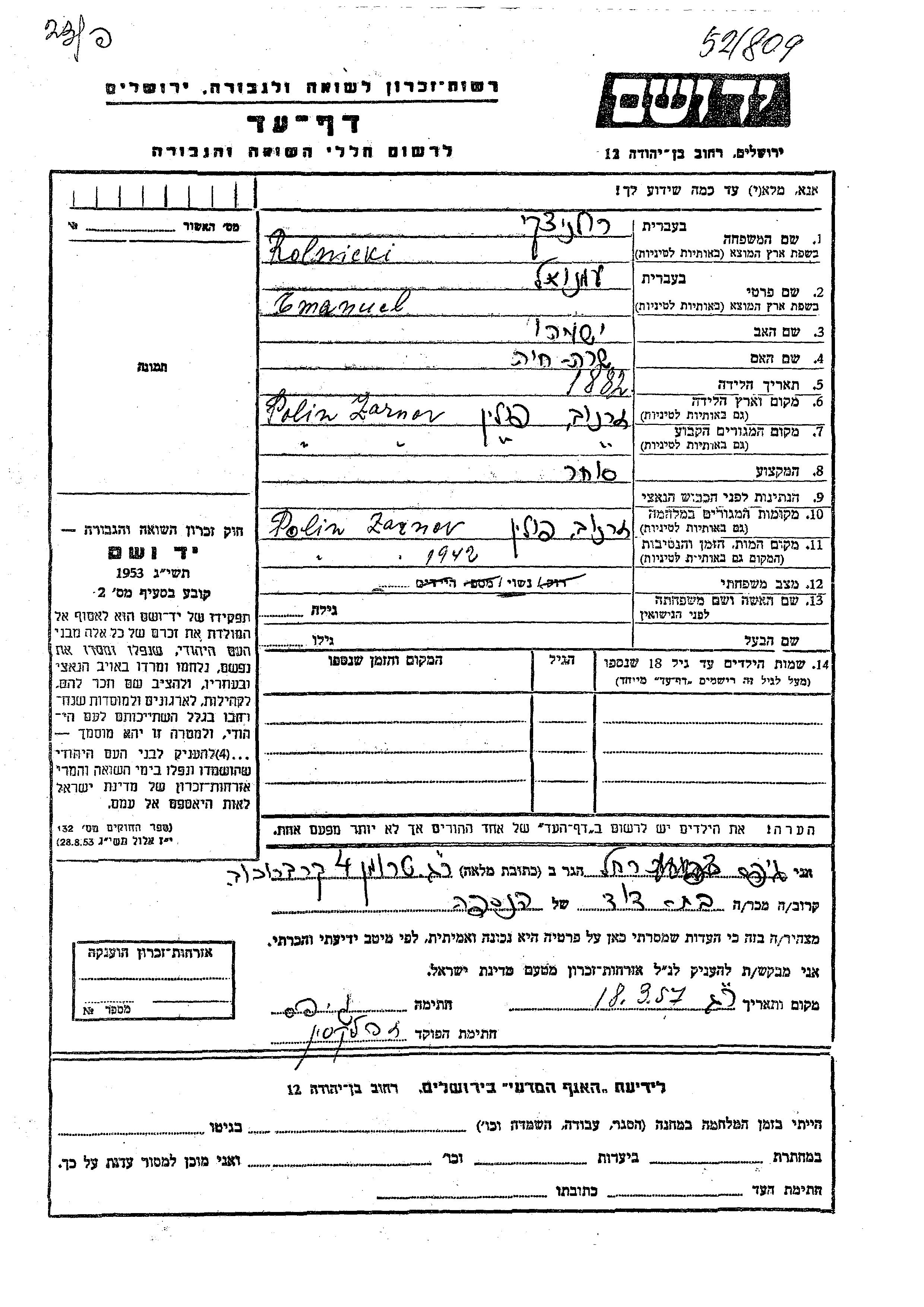 Emanuel Rolnicki wurde im Jahr 1882 in Zarnov, Polen geboren. Er war der Sohn von Yeshayahu und Sara Khaia. Er war Kaufmann/-frau und Verheiratet. Vor dem Zweiten Weltkrieg lebte er in Zarnov, Polen. Während des Krieges war er in Zarnov, Polen.