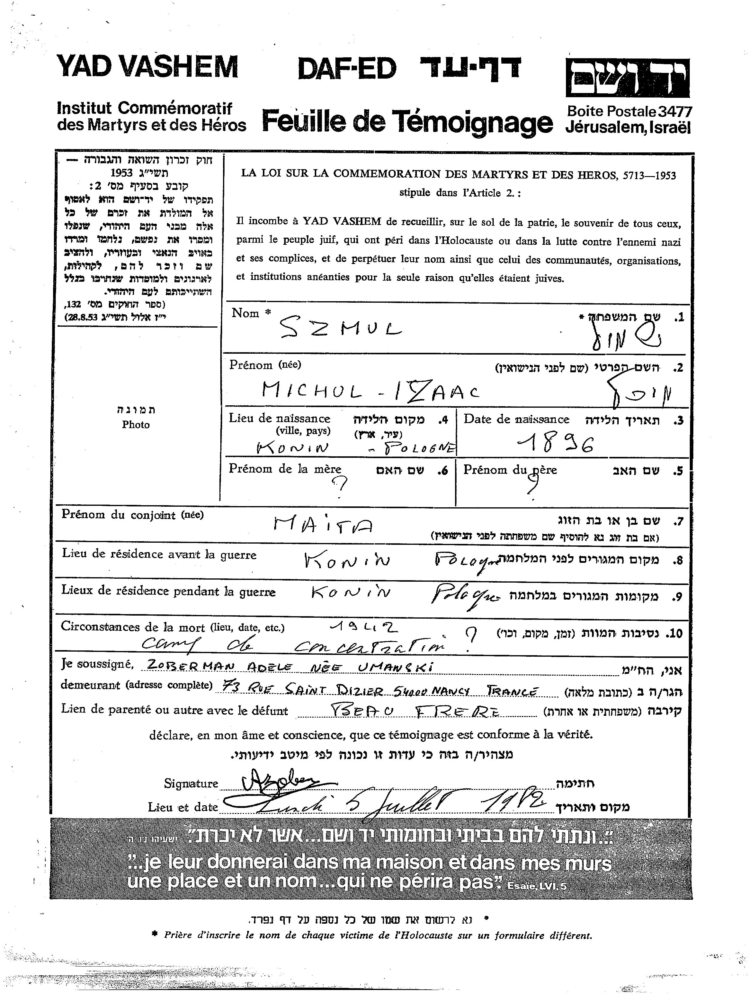 Michol Izaac Szmul wurde im Jahr 1896 in Konin, Polen geboren. Er war mit Maita Verheiratet. Vor dem Zweiten Weltkrieg lebte er in Konin, Polen. Während des Krieges war er in Konin, Polen.
