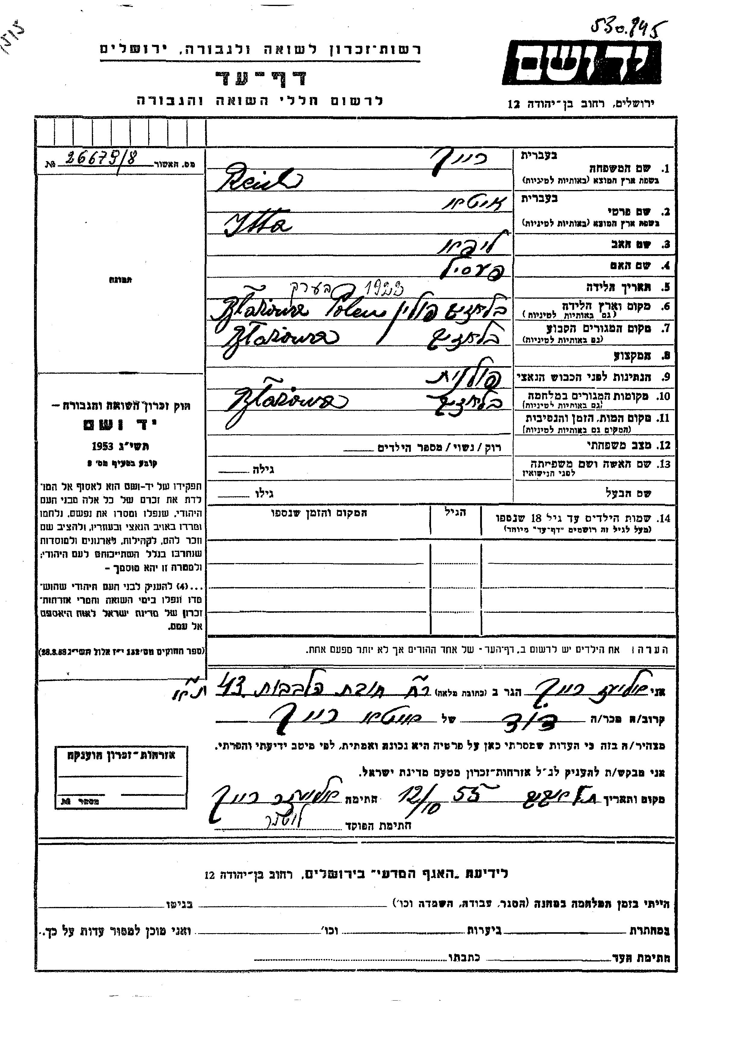 Itta Reich wurde im Jahr 1923 in Blazhova, Polen geboren. Sie war die Tochter von Lipa und Pesil. Vor dem Zweiten Weltkrieg lebte sie in Blazhova, Polen. Während des Krieges war sie in Blazhova, Polen.