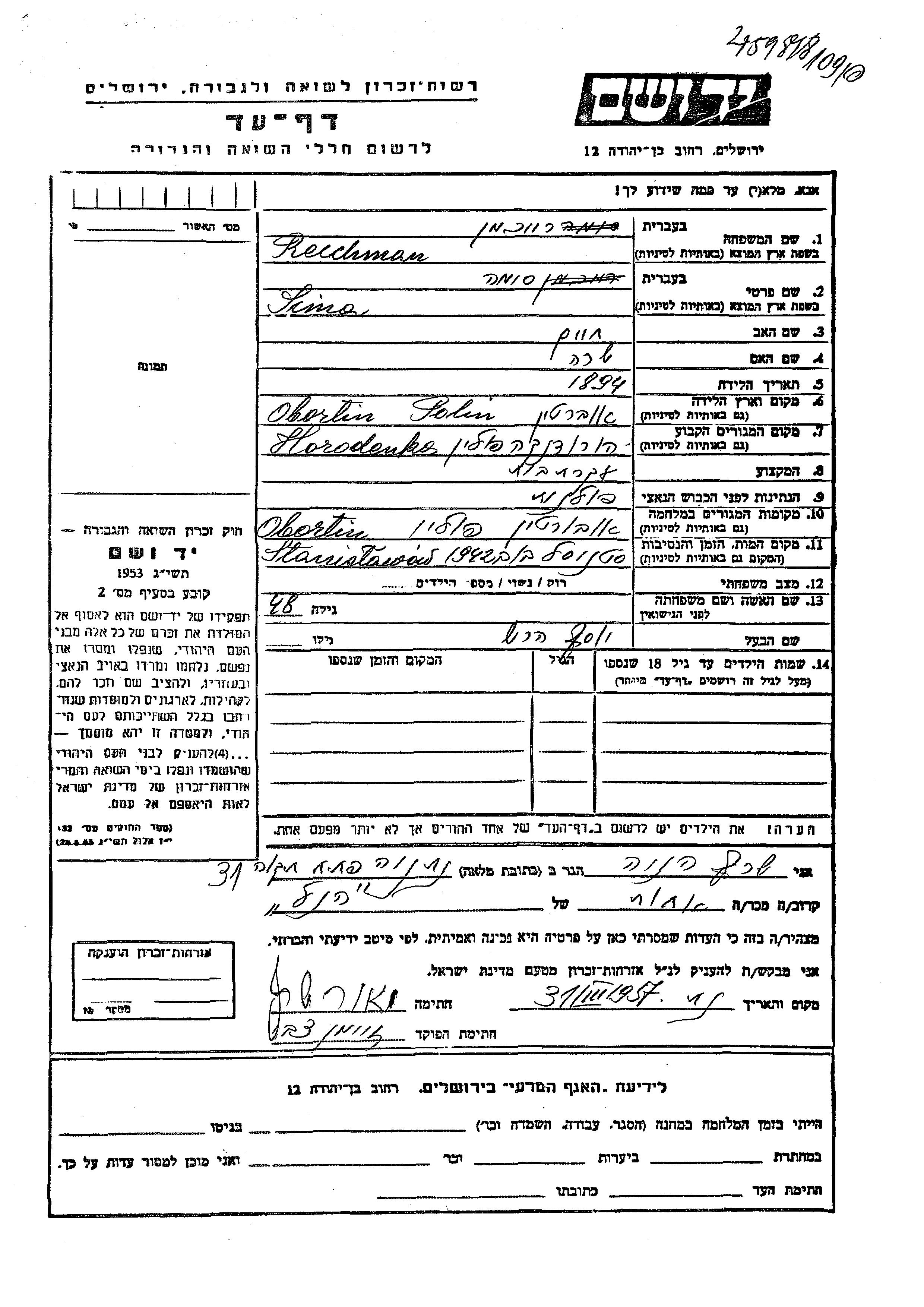 Sima Reichman wurde im Jahr 1894 in Obertin, Polen geboren. Sie war die Tochter von Khaim und Sara. Sie war Hausfrau. Vor dem Zweiten Weltkrieg lebte sie in Horodenka, Polen. Während des Krieges war sie in Obertin, Polen.