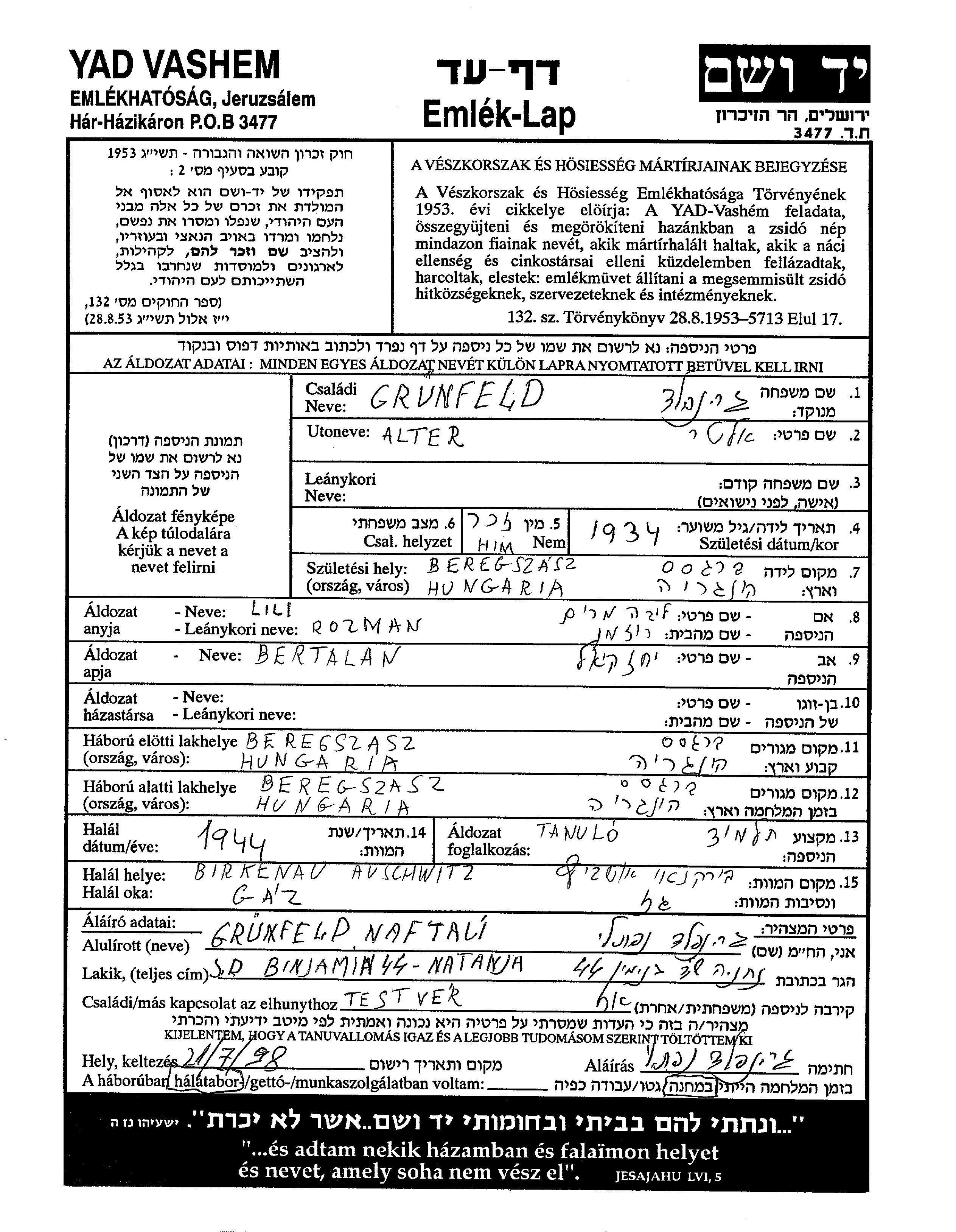 Alter Grunfeld wurde im Jahr 1934 in Beregszasz, Tschechoslowakei geboren. Er war der Sohn von Bertalan Yekhezkel und Lili Liba Miriam. Er war Schüler/-in. Vor dem Zweiten Weltkrieg lebte er in Beregszasz, Tschechoslowakei. Während des Krieges war er in Beregszasz, Tschechoslowakei.