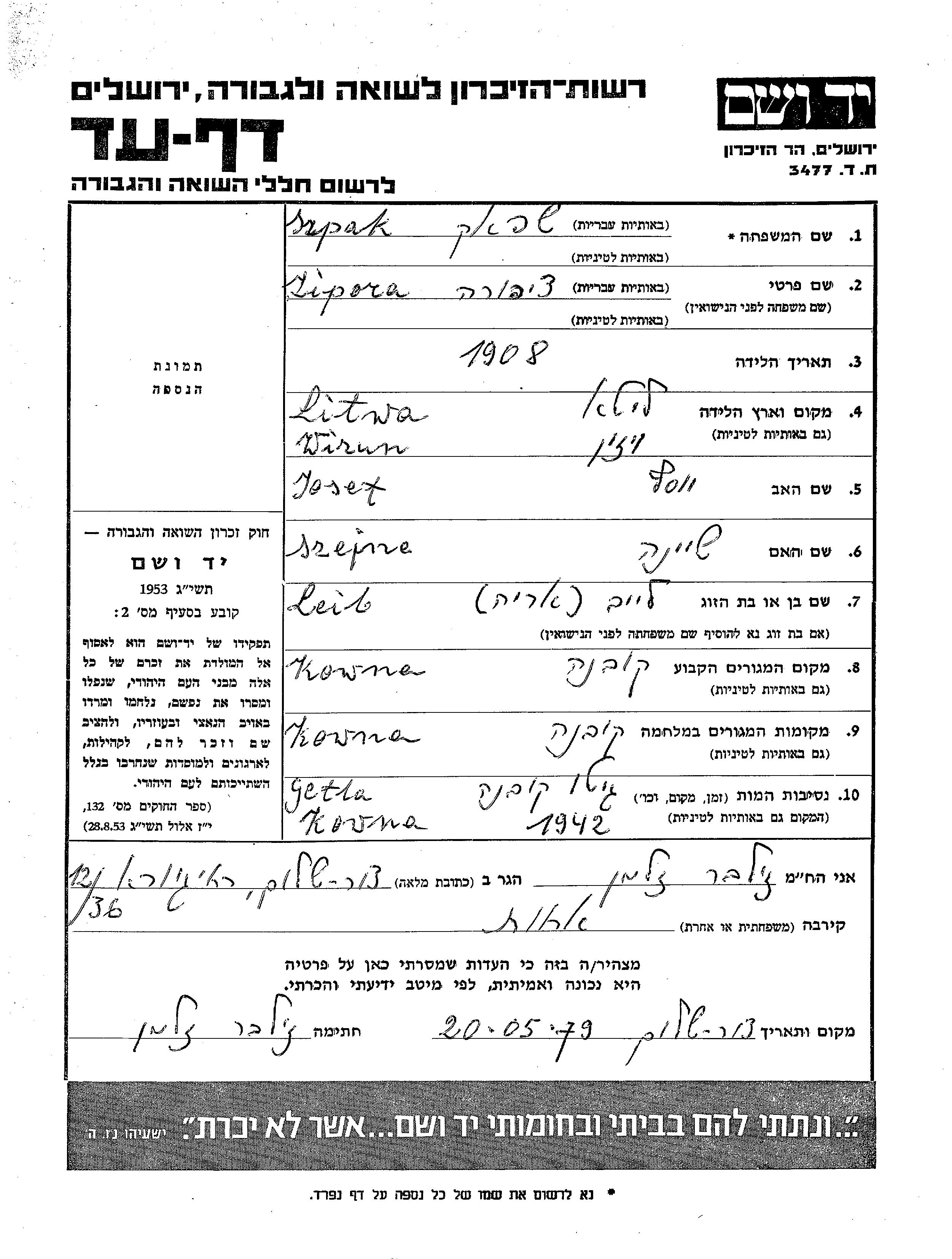 Szpak Zipora 1908 Kowna, Litauen Gedenkblatt