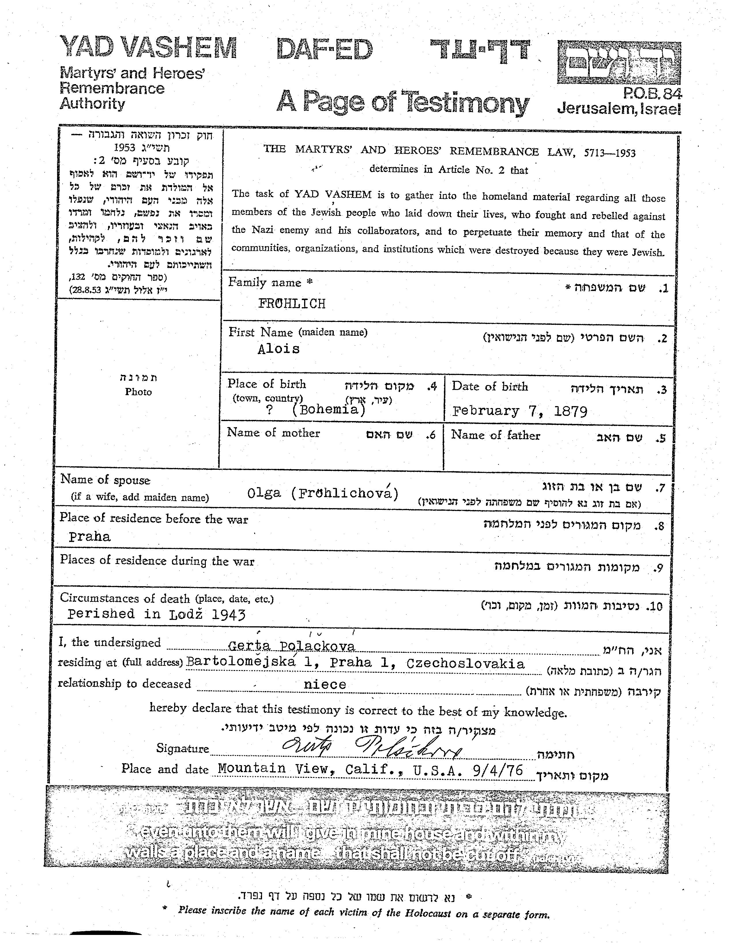 Alois Frohlich wurde im Jahr 1879 in Bohemia, Tschechoslowakei geboren. Er war mit Olga Verheiratet. Vor dem Zweiten Weltkrieg lebte er in Praha, Tschechoslowakei.