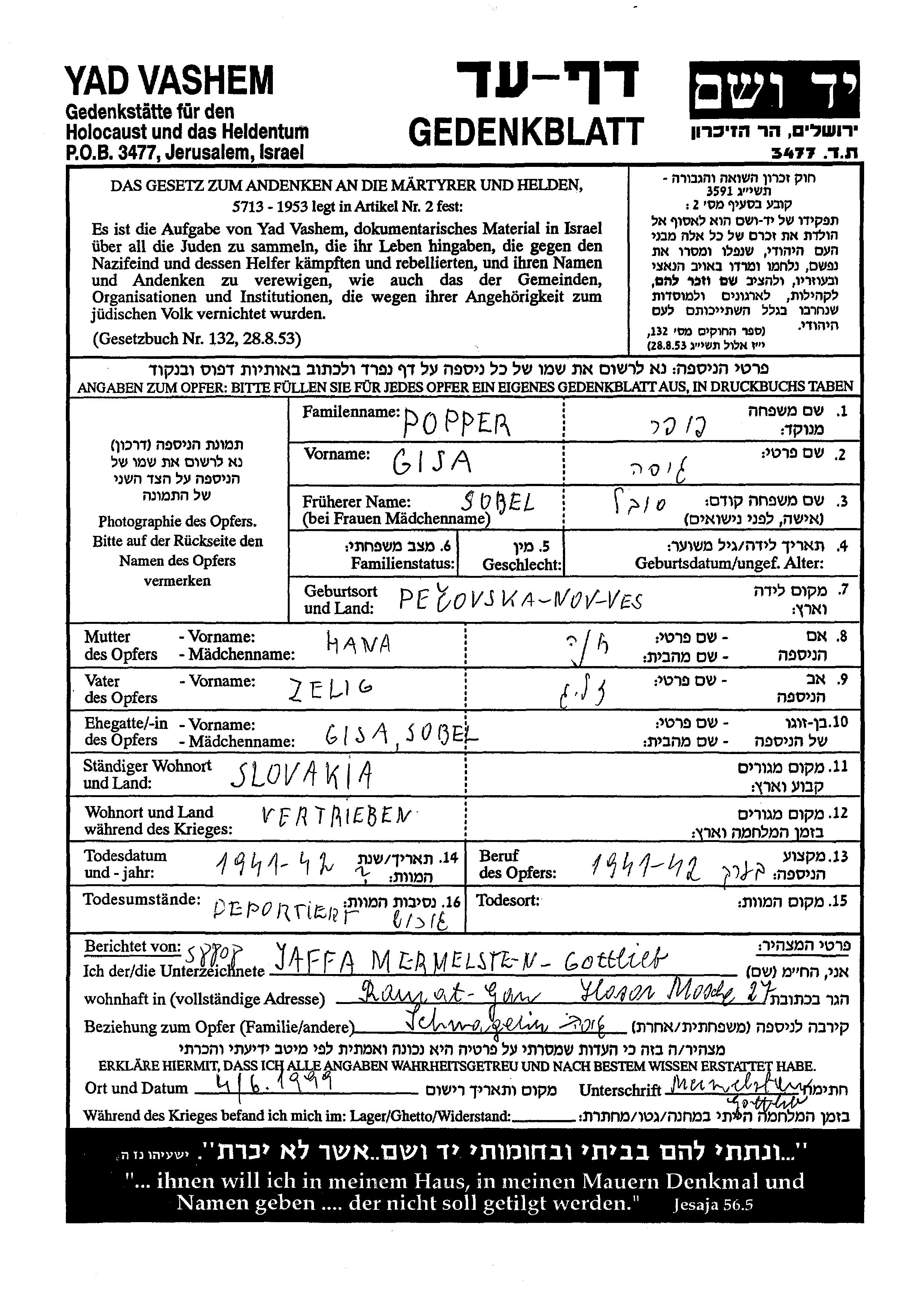 Gisa Popper, geb. Sobel wurde in Pecovska Nova Ves, Tschechoslowakei geboren. Sie war die Tochter von Zelig und Khana. Vor dem Zweiten Weltkrieg lebte sie in Slovakia, Tschechoslowakei. Während des Krieges war sie in Slowakei.