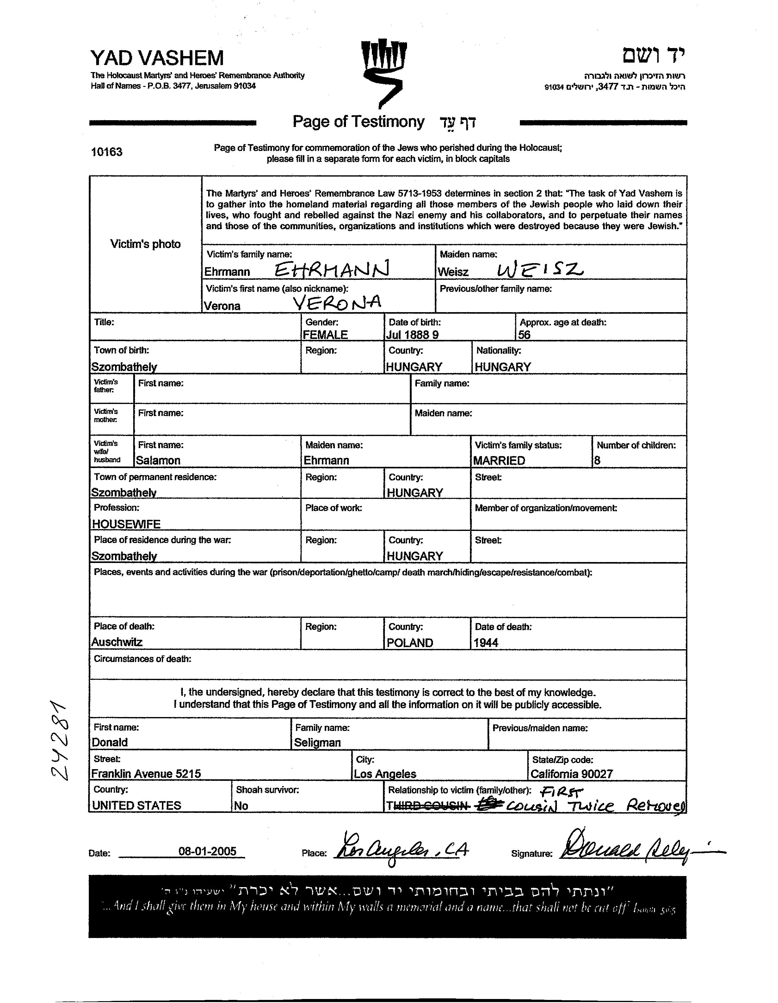 Verona Ehrmann, geb. Weisz wurde im Jahr 1888 in Szombathely, Ungarn geboren. Sie war mit Salamon, geb. Ehrmann Verheiratet. Vor dem Zweiten Weltkrieg lebte sie in Szombathely, Ungarn. Während des Krieges war sie in Szombathely, Ungarn.
