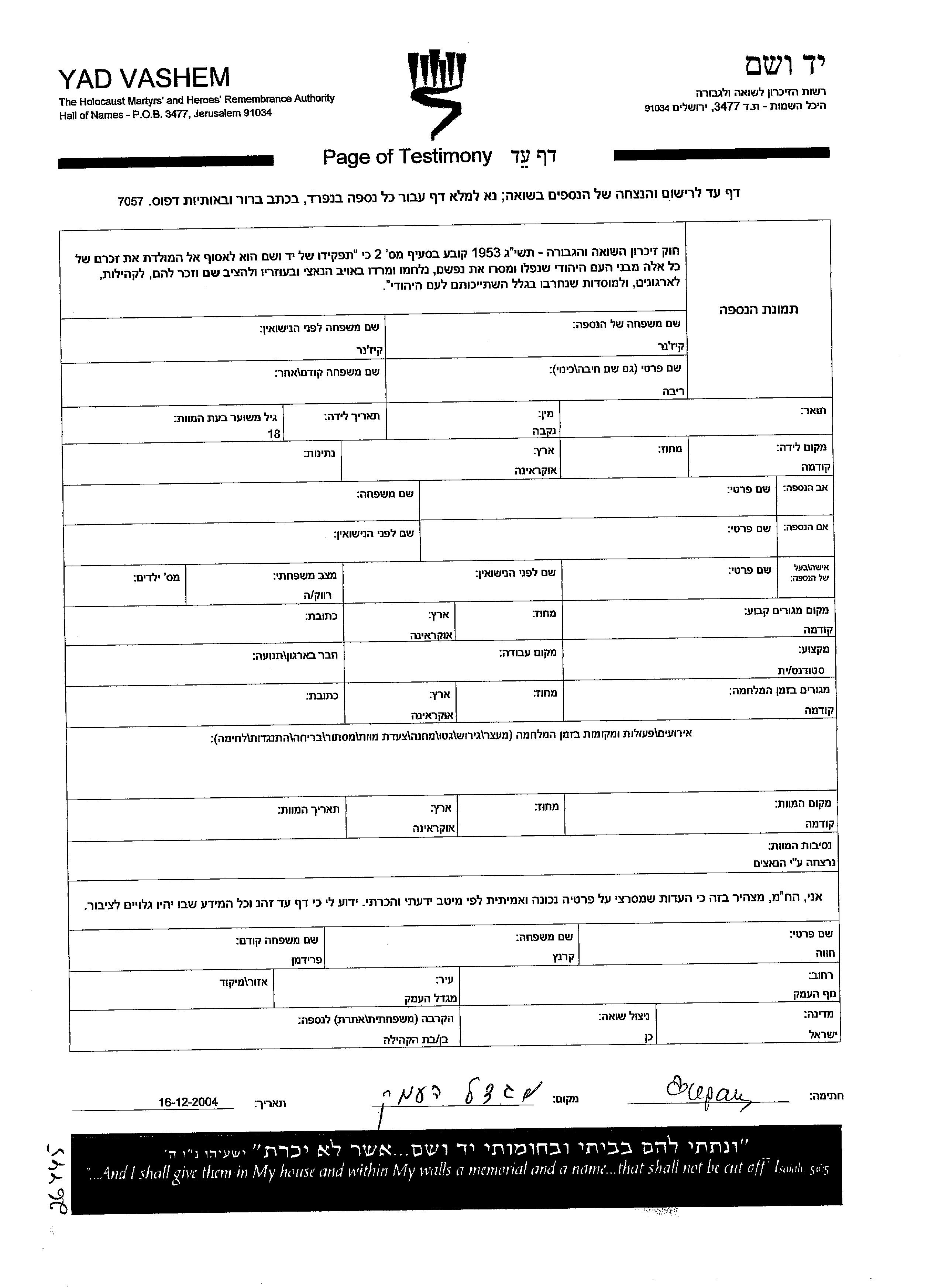 Riva Kizhner wurde in Kodyma, Ukraine (UdSSR) geboren. Sie war Ledig. Vor dem Zweiten Weltkrieg lebte sie in Kodyma, Ukraine (UdSSR). Während des Krieges war sie in Kodyma, Ukraine (UdSSR).