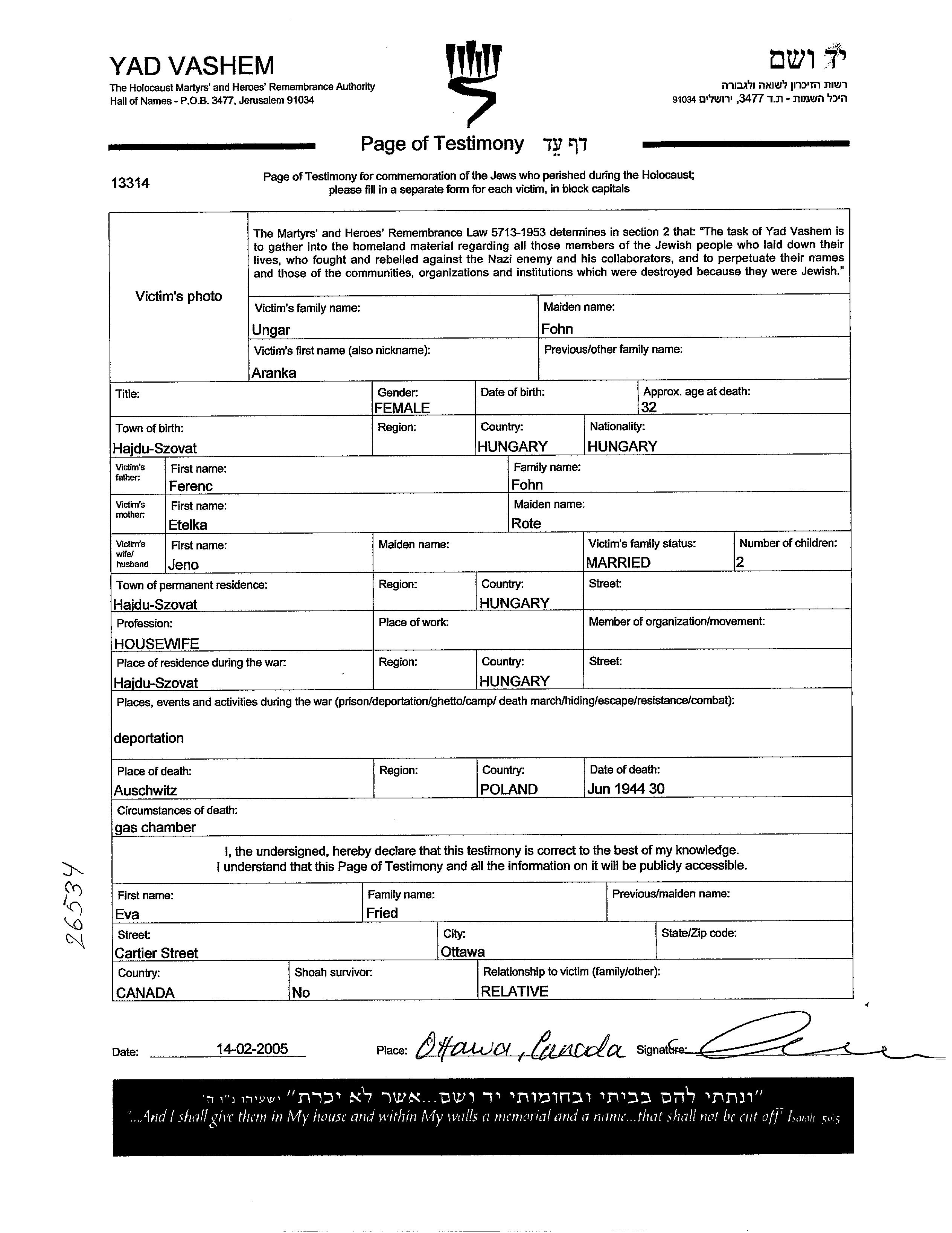 Aranka Ungar, geb. Fohn wurde in Hajduszovat, Ungarn geboren. Sie war die Tochter von Ferentz und Etelka, geb. Rote. Sie war mit Jeno Verheiratet. Vor dem Zweiten Weltkrieg lebte sie in Hajduszovat, Ungarn. Während des Krieges war sie in Hajduszovat, Ungarn.