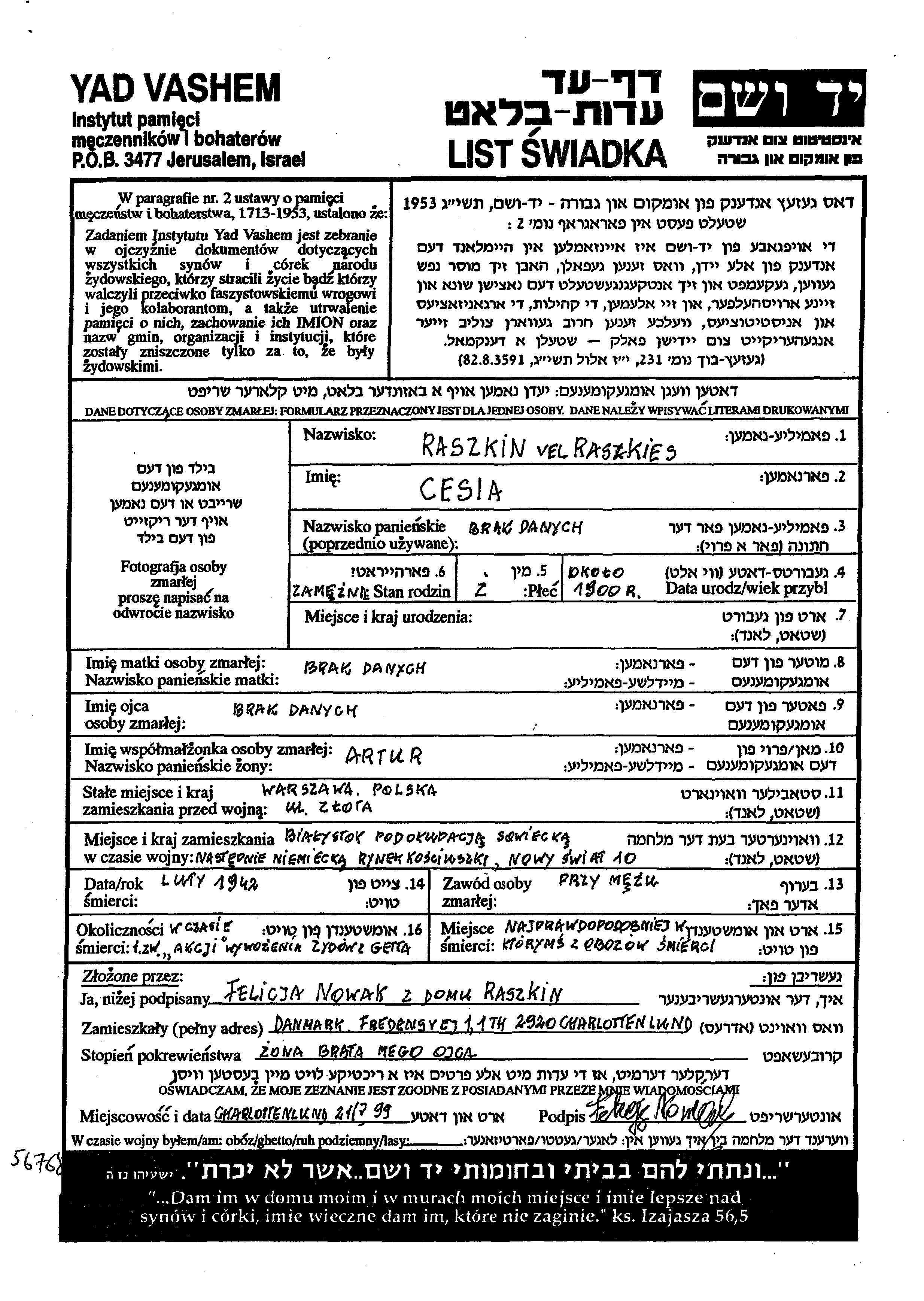 Cesia Raszkin Raszkies wurde im Jahr 1900 geboren. Sie war mit Artur Verheiratet. Vor dem Zweiten Weltkrieg lebte sie in Warszawa, Polen. Während des Krieges war sie in Bialystok, Polen.