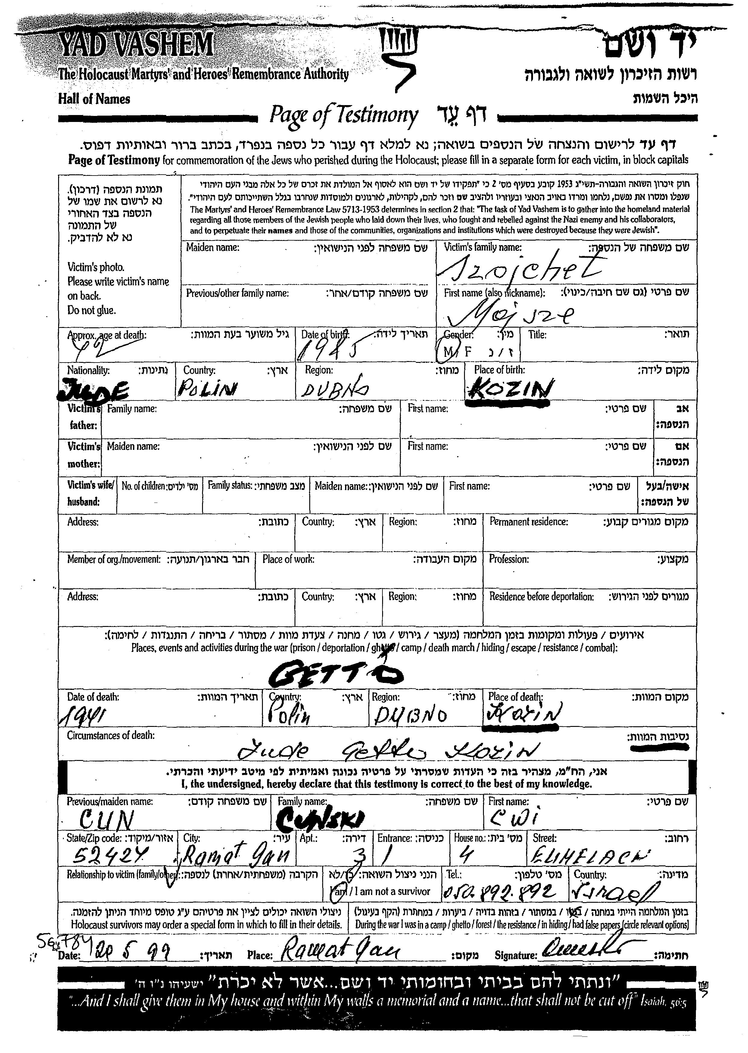 Mojsze wurde in der Schoah ermordet. Todesort: Kozin, Polen im Jahr 1941.