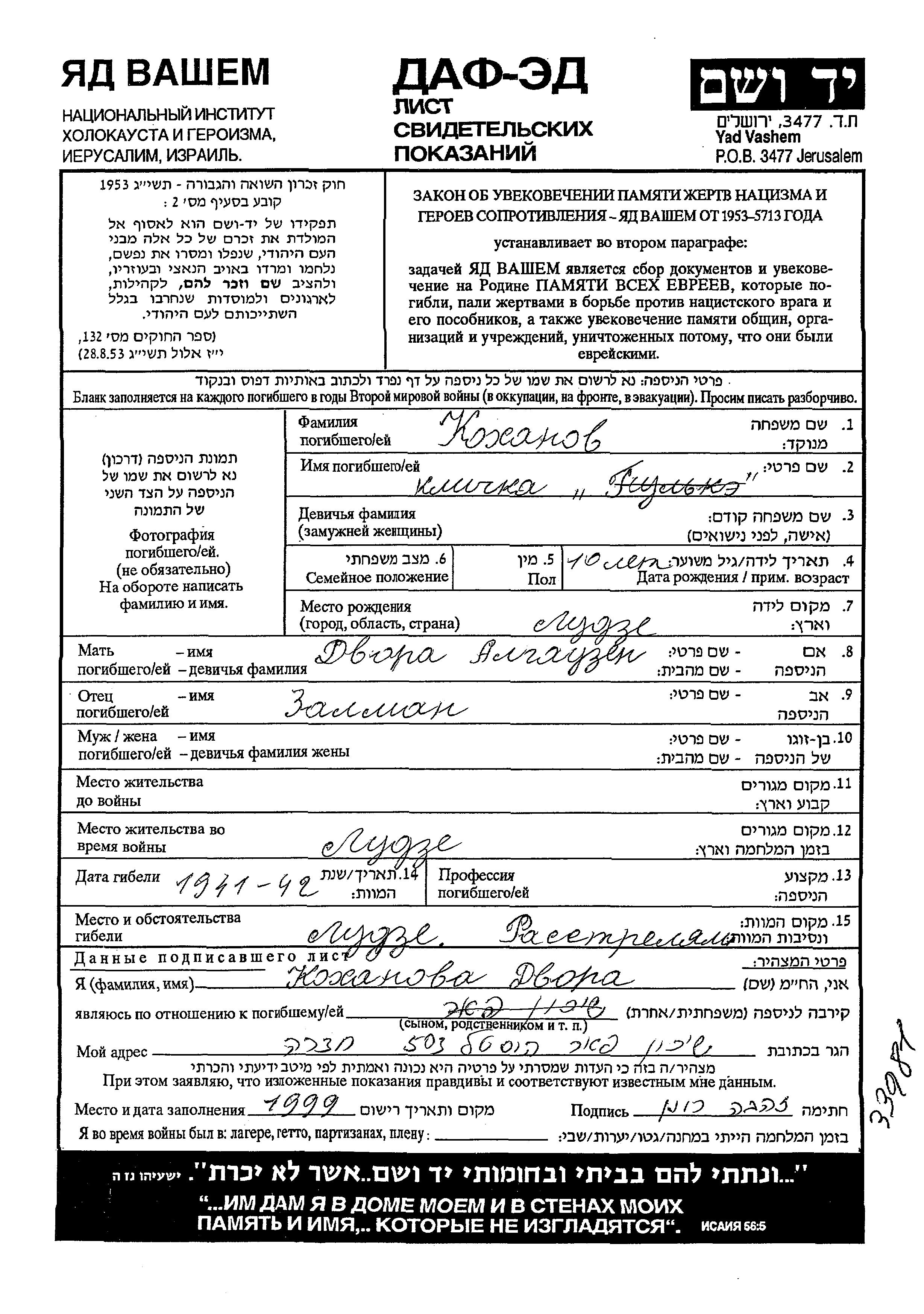 Vorname unbekannt Kokhanov wurde in Ludza, Lettland geboren. Er war der Sohn von Zalman und Dvora, geb. Algauzen. Er war Kind. Vor dem Zweiten Weltkrieg lebte er in Ludza, Lettland. Während des Krieges war er in Ludza, Lettland.