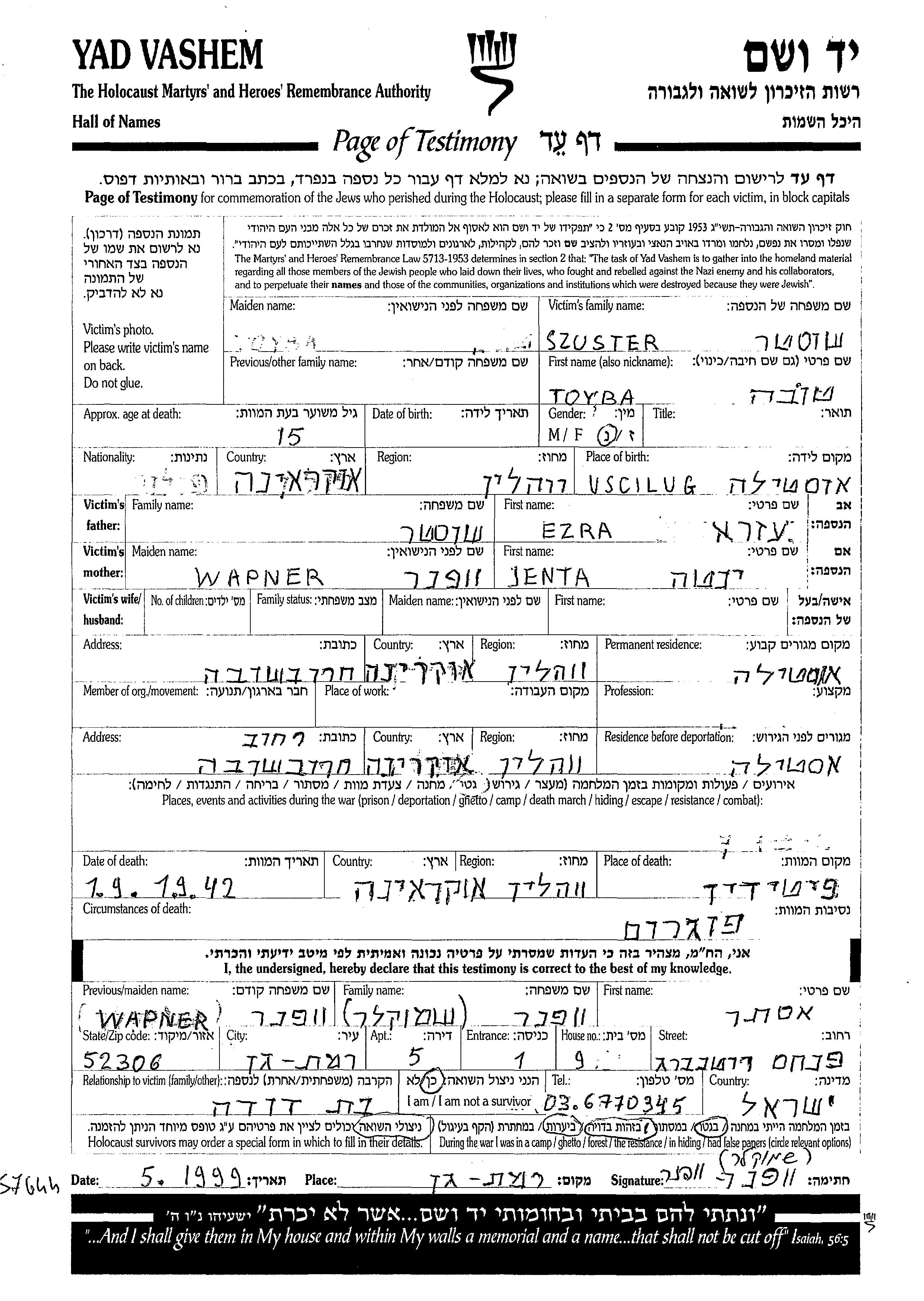 Toyba wurde in der Schoah ermordet. Todesort: Piatidin, Polen im Jahr 01/09/1942.