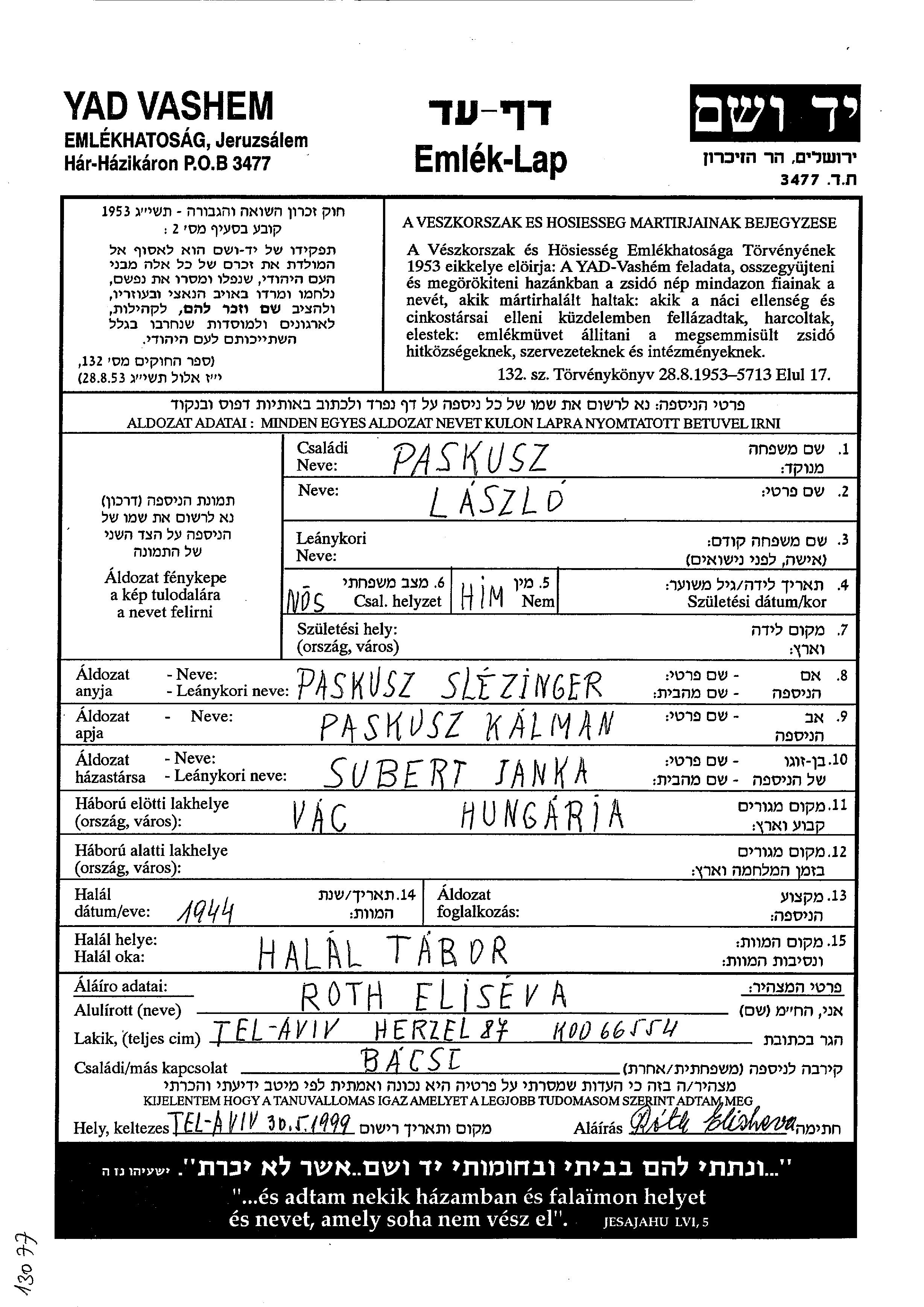 Laszlo Paskusz wurde Er war der Sohn von Kalman, geb. Slezinger. Er war mit Janka, geb. Subert Verheiratet. Vor dem Zweiten Weltkrieg lebte er in Vac, Ungarn. Während des Krieges war er in Vac, Ungarn.