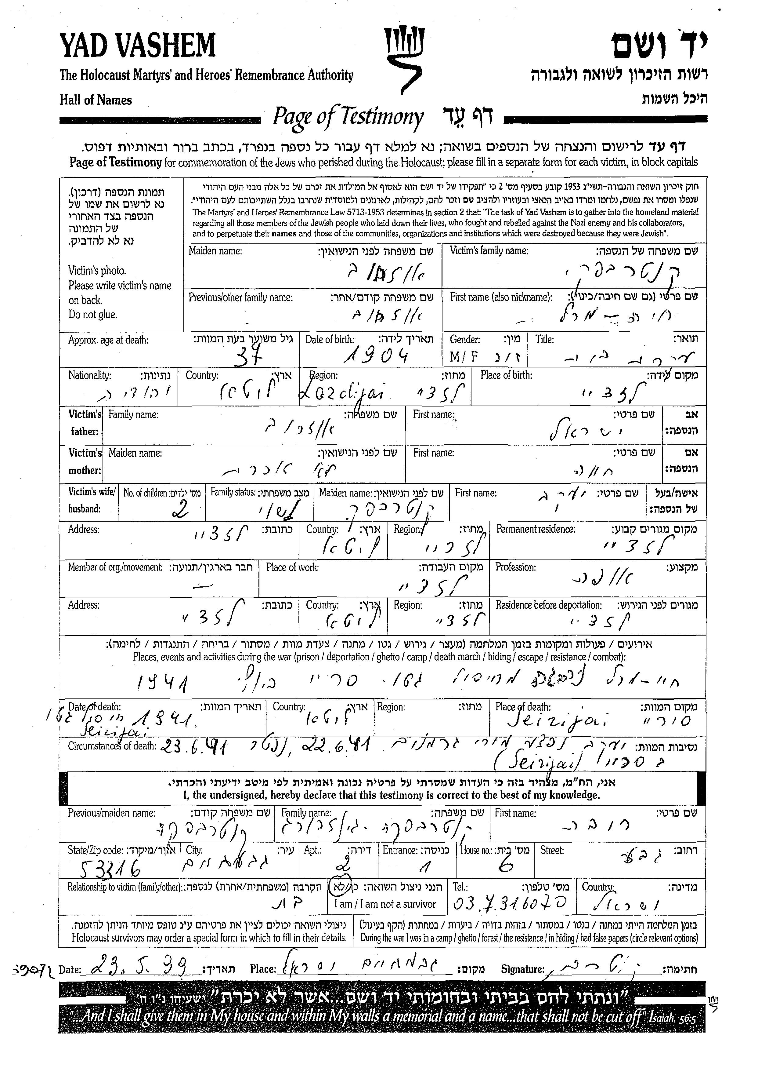 Kantorovski Miriam Khaia 1904 Lazdijai, Litauen Gedenkblatt