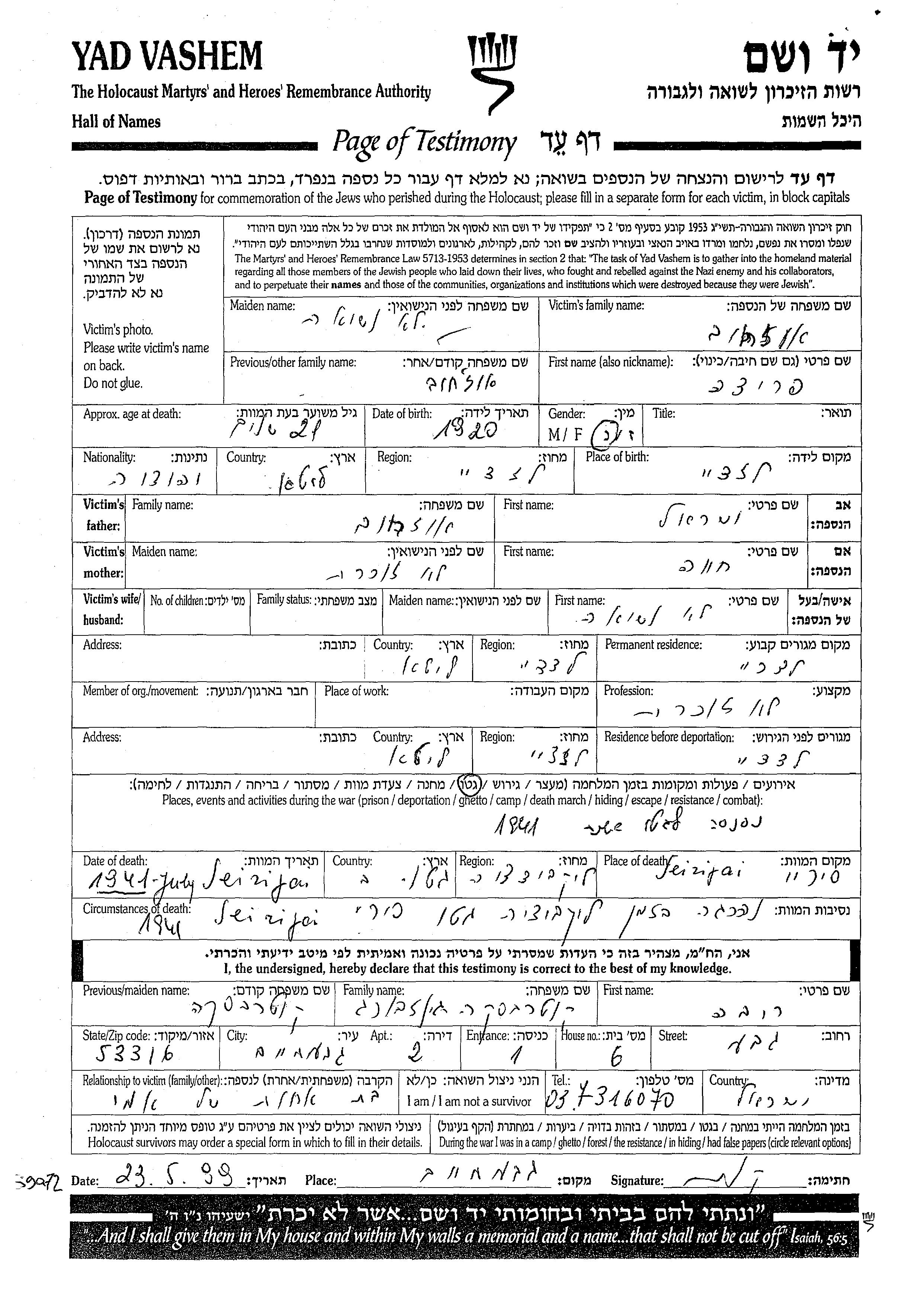 Frida אוזחוב wurde im Jahr 1920 in Lozdzej, Litauen geboren. Sie war die Tochter von Yisrael und Khava. Sie war Ledig. Vor dem Zweiten Weltkrieg lebte sie in Lozdzej, Litauen. Während des Krieges war sie in Lozdzej, Litauen.