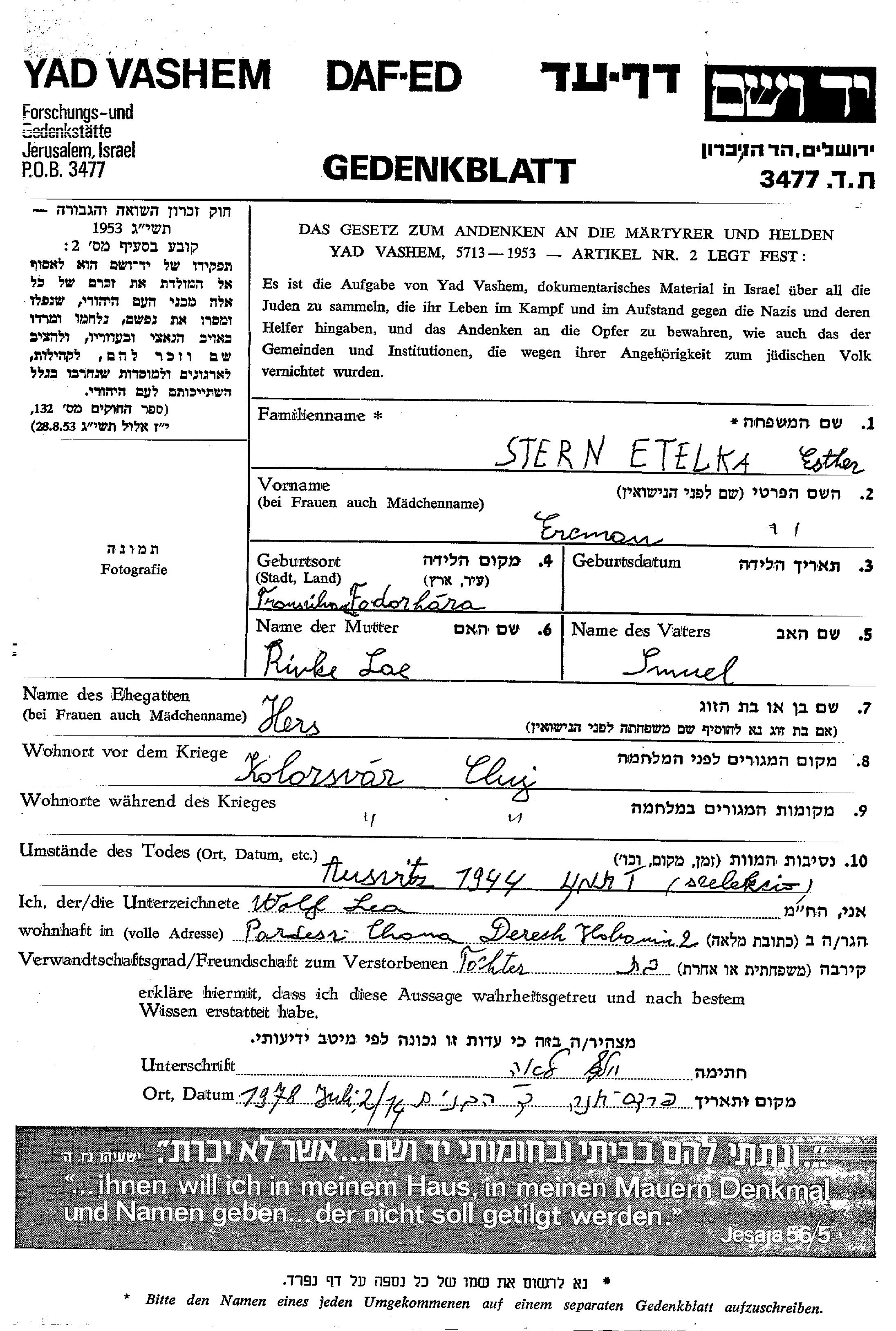 Etelka Stern, geb. Ercman wurde in Fodorhaza, Rumänien geboren. Sie war die Tochter von Smuel und Rivke. Sie war mit Hers Verheiratet. Vor dem Zweiten Weltkrieg lebte sie in Kolozsvar, Rumänien. Während des Krieges war sie in Kolozsvar, Rumänien.