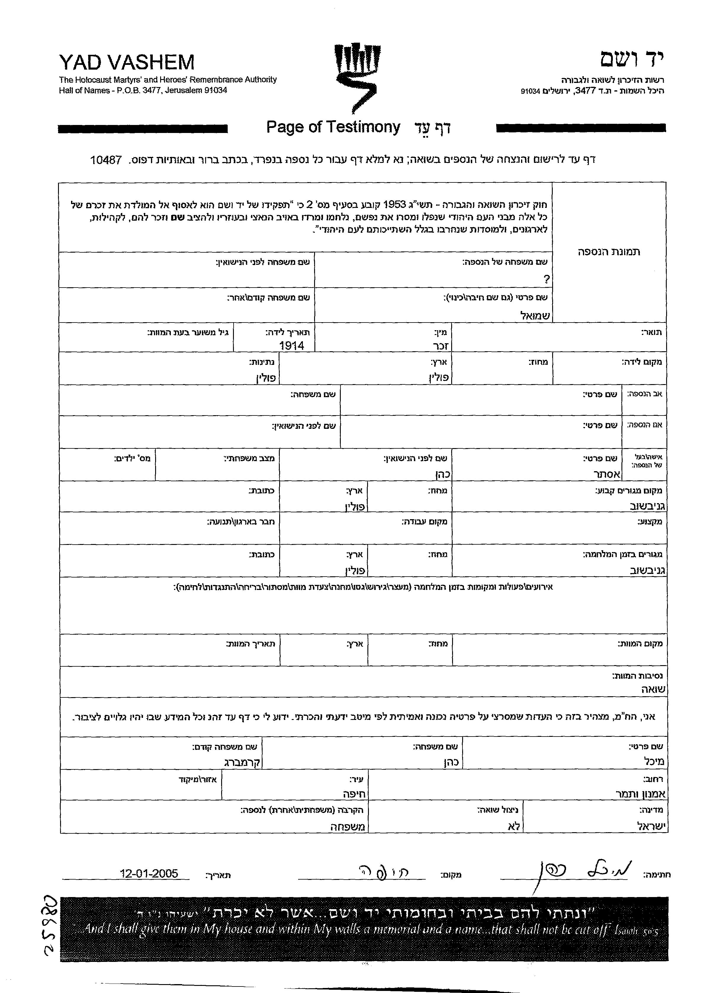 Shmuel Name unbekannt wurde im Jahr 1914 in Polen geboren. Vor dem Zweiten Weltkrieg lebte er in Geniweszow, Polen. Während des Krieges war er in Geniweszow, Polen.