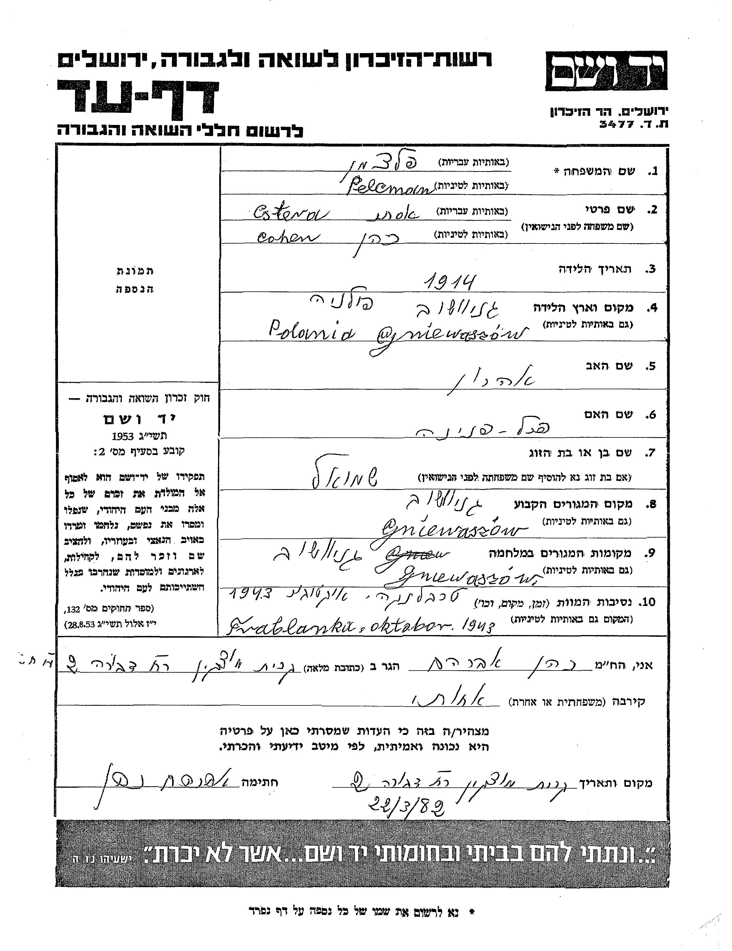 Ester Name unbekannt, geb. Kohen wurde im Jahr 1914 in Gniewoszow, Polen geboren. Sie war die Tochter von Aharon und Pnina. Sie war mit Shmuel Verheiratet. Vor dem Zweiten Weltkrieg lebte sie in Gniewoszow, Polen. Während des Krieges war sie in Gniewoszow, Polen.