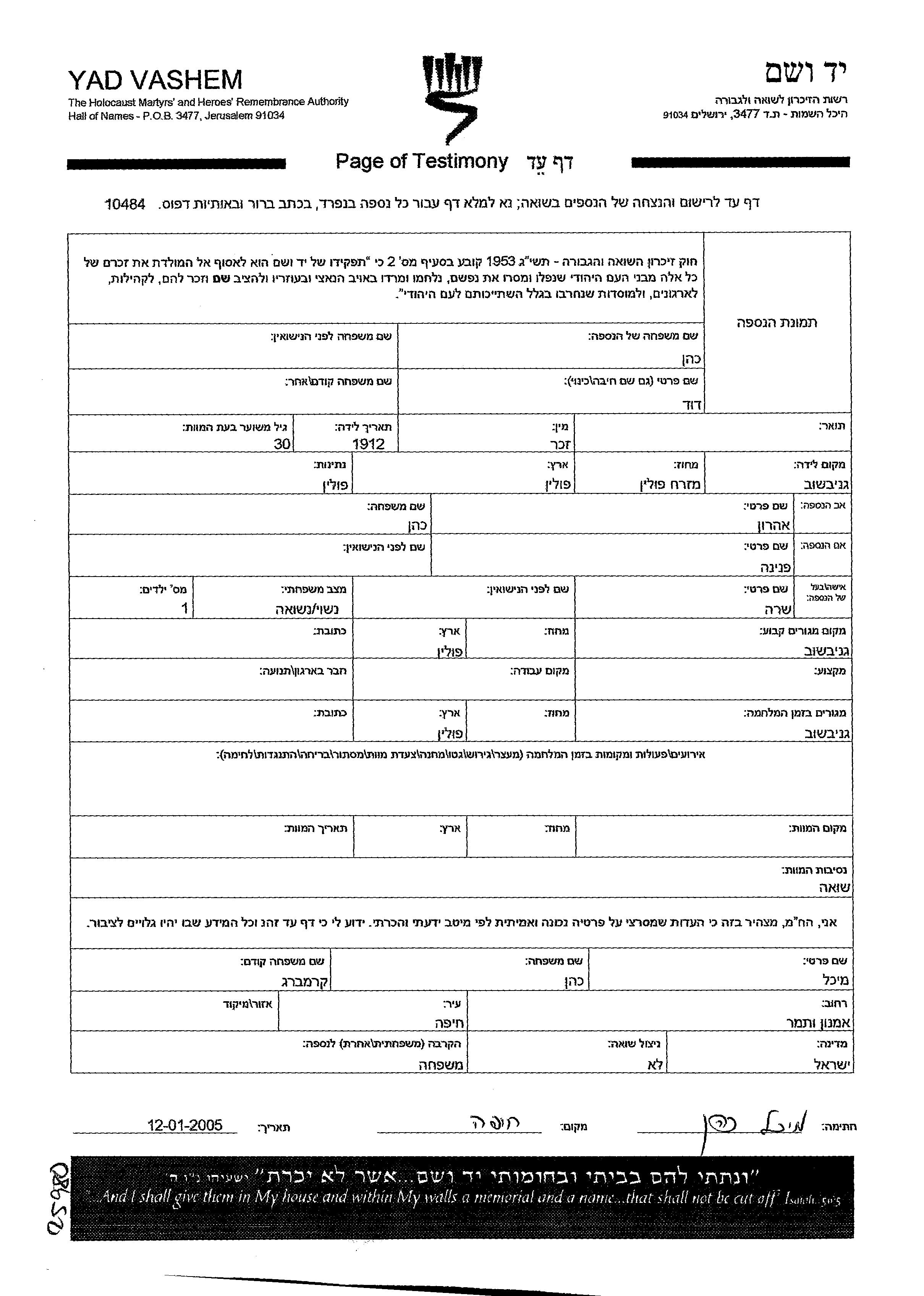 David Kohen wurde im Jahr 1912 in Gniewoszow, Polen geboren. Er war der Sohn von Aharon und Pnina. Er war mit Sara Verheiratet. Vor dem Zweiten Weltkrieg lebte er in Gniewoszow, Polen. Während des Krieges war er in Gniewoszow, Polen.