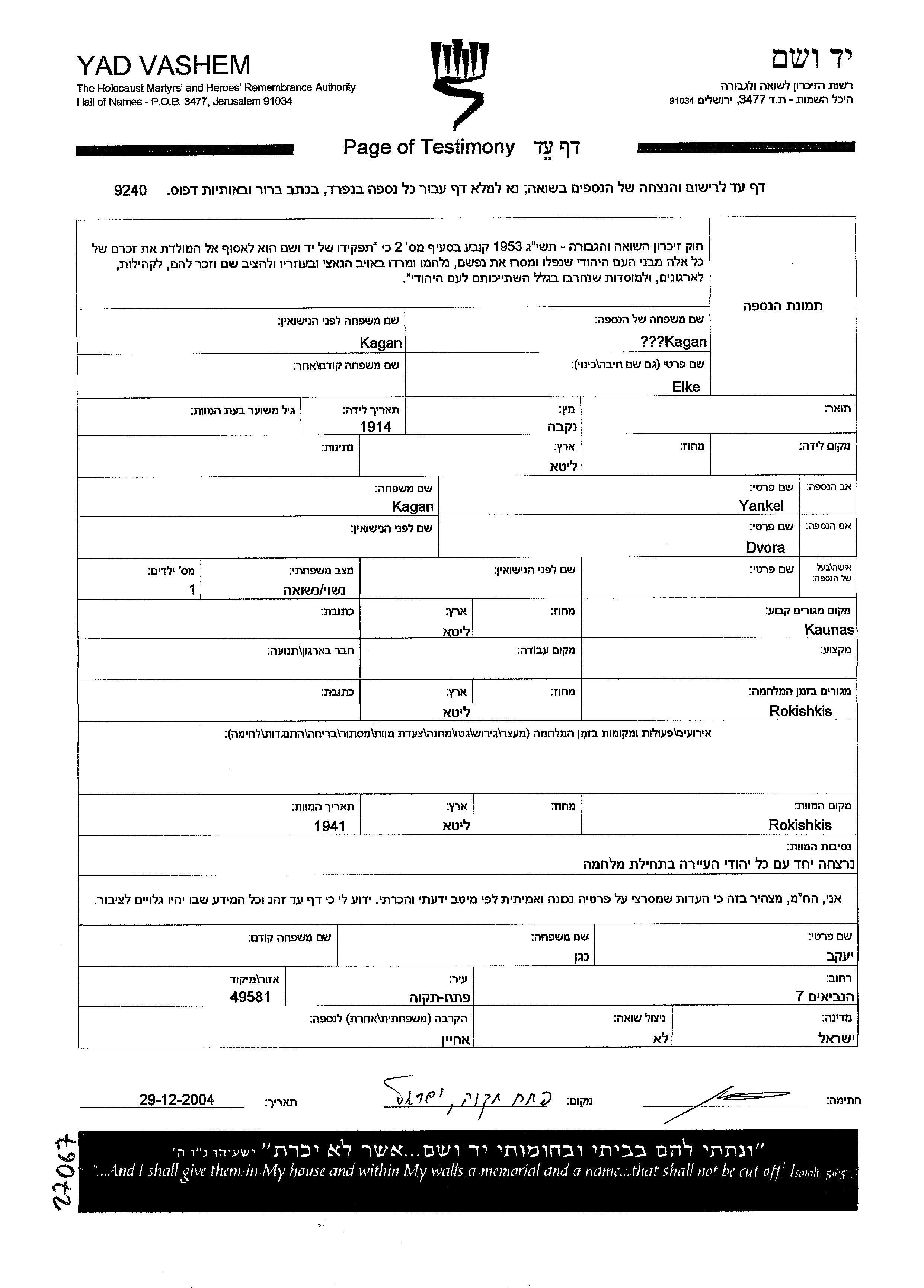 Elke Kagan, geb. Kagan wurde im Jahr 1914 in Litauen geboren. Sie war die Tochter von Yankel und Dvora. Sie war Verheiratet. Vor dem Zweiten Weltkrieg lebte sie in Kaunas, Litauen. Während des Krieges war sie in Kaunas, Litauen.