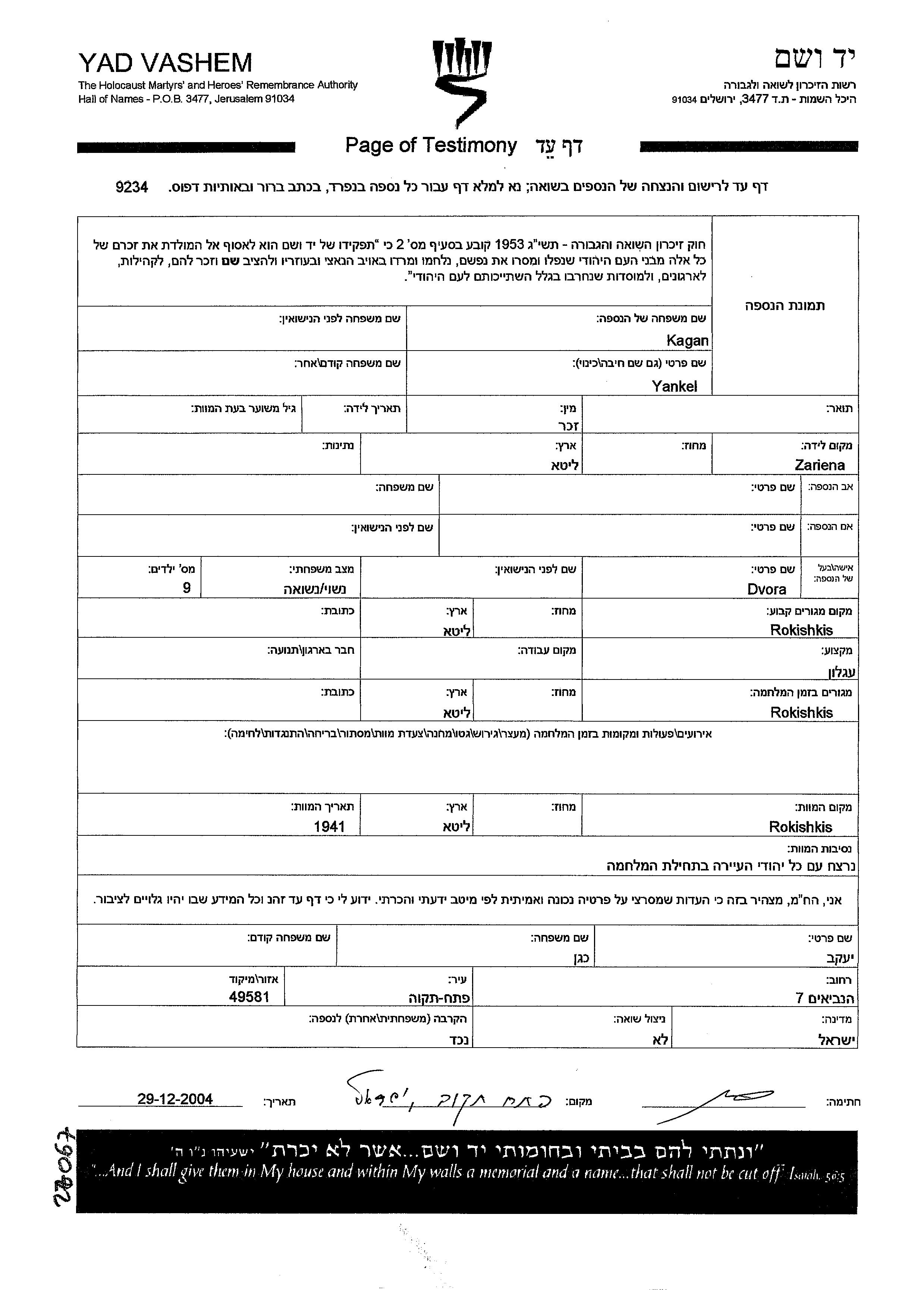 Yankel Kagan wurde in Zarenai, Litauen geboren. Er war mit Dvora Verheiratet. Vor dem Zweiten Weltkrieg lebte er in Rokishkis, Litauen. Während des Krieges war er in Rokishkis, Litauen.