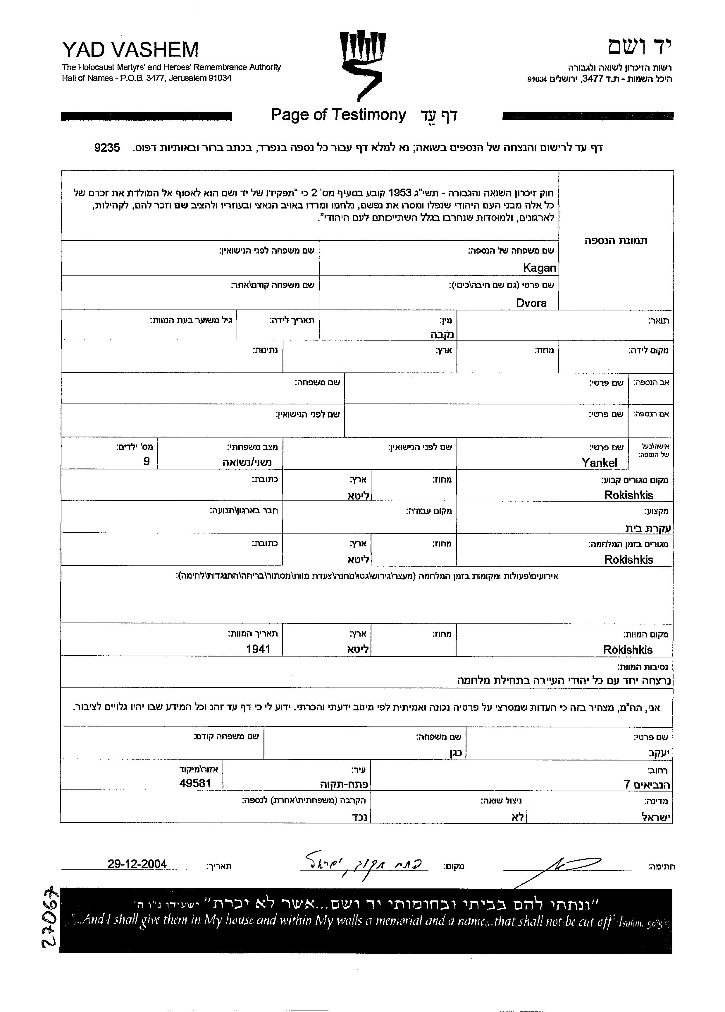 Dvora Kagan. Sie war mit Yankel Verheiratet. Vor dem Zweiten Weltkrieg lebte sie in Rokishkis, Litauen. Während des Krieges war sie in Rokishkis, Litauen.