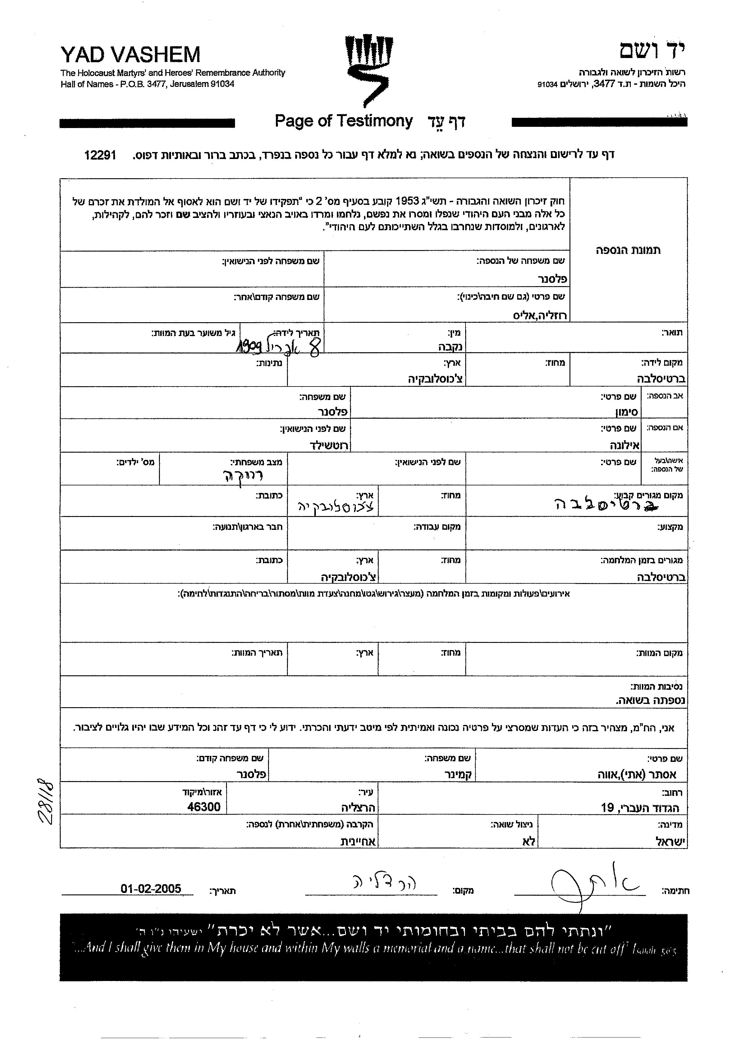 Rozalia Alice Felsner wurde im Jahr 1909 in Bratislava, Tschechoslowakei geboren. Sie war die Tochter von Simon und Ilona, geb. Rotshild. Vor dem Zweiten Weltkrieg lebte sie in Bratislava, Tschechoslowakei. Während des Krieges war sie in Bratislava, Tschechoslowakei.