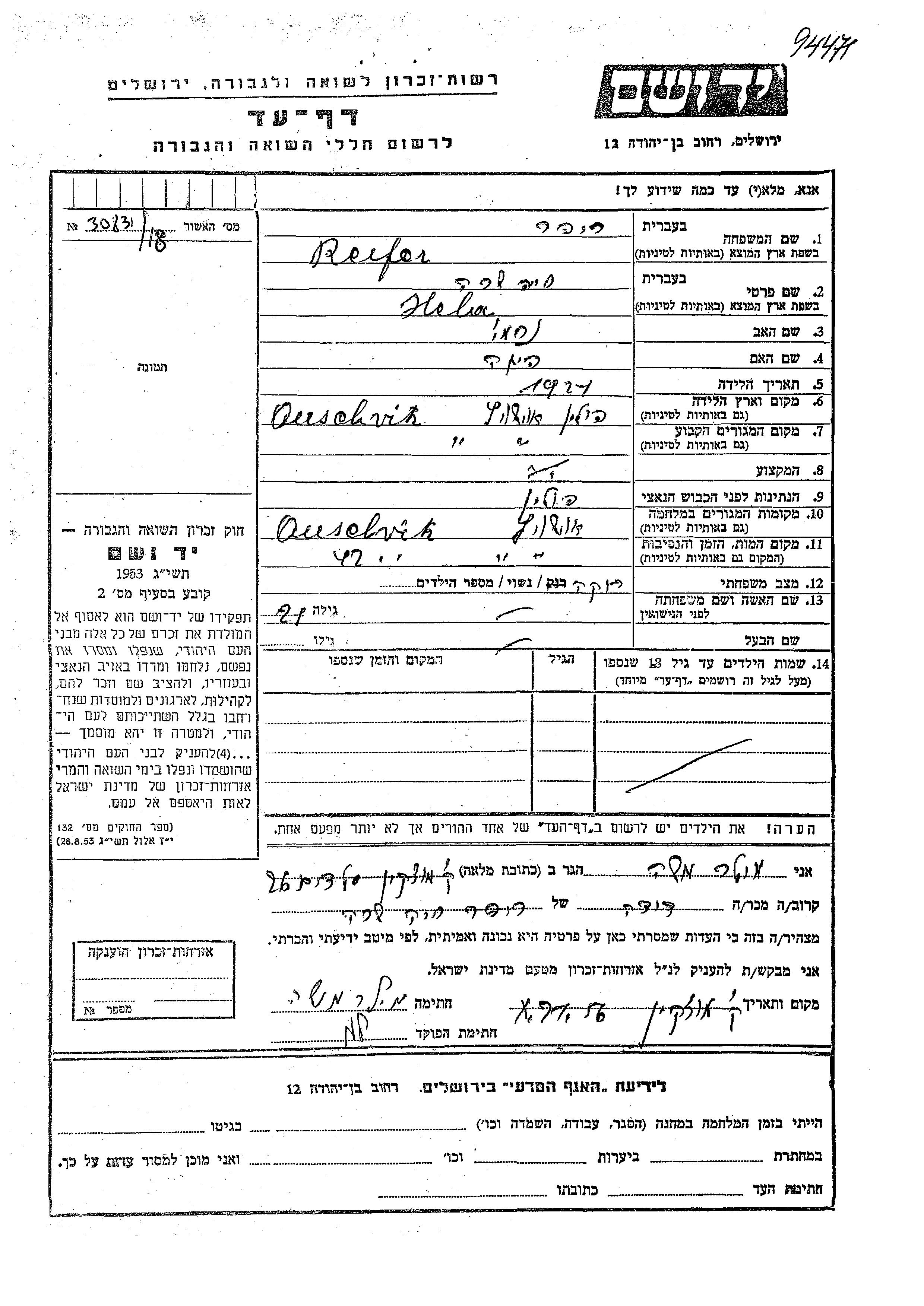 Hela Khaia Sara Reifer Riper wurde im Jahr 1927 in Auschwitz, Polen geboren. Sie war die Tochter von Nekhemia und Feiga. Sie war Ledig. Vor dem Zweiten Weltkrieg lebte sie in Auschwitz, Polen. Während des Krieges war sie in Auschwitz, Polen.