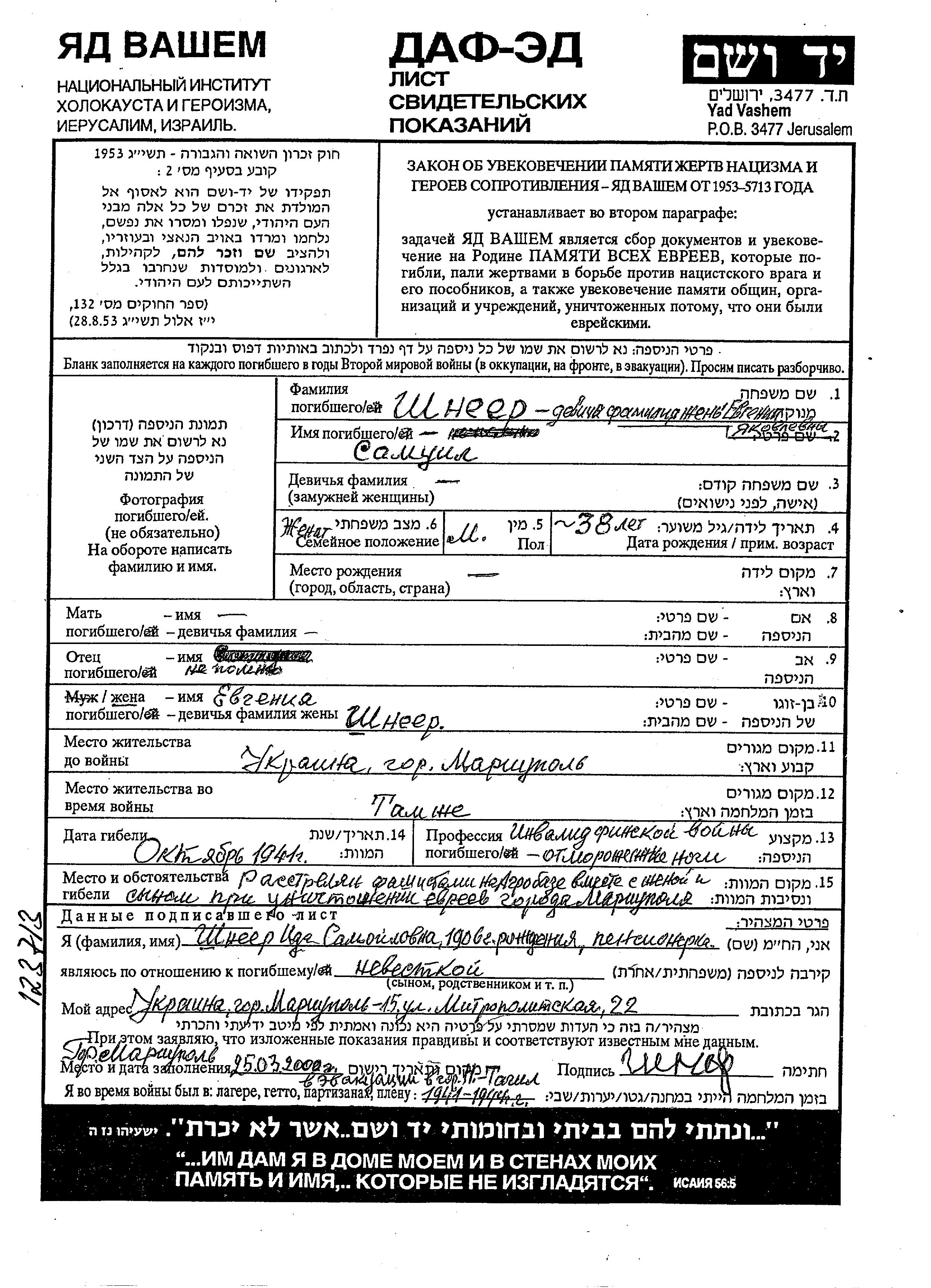 Samuil Name unbekannt. Er war mit Yevgeniya, geb. Shneyer Verheiratet. Vor dem Zweiten Weltkrieg lebte er in Mariupol, Ukraine (UdSSR). Während des Krieges war er in Mariupol, Ukraine (UdSSR).