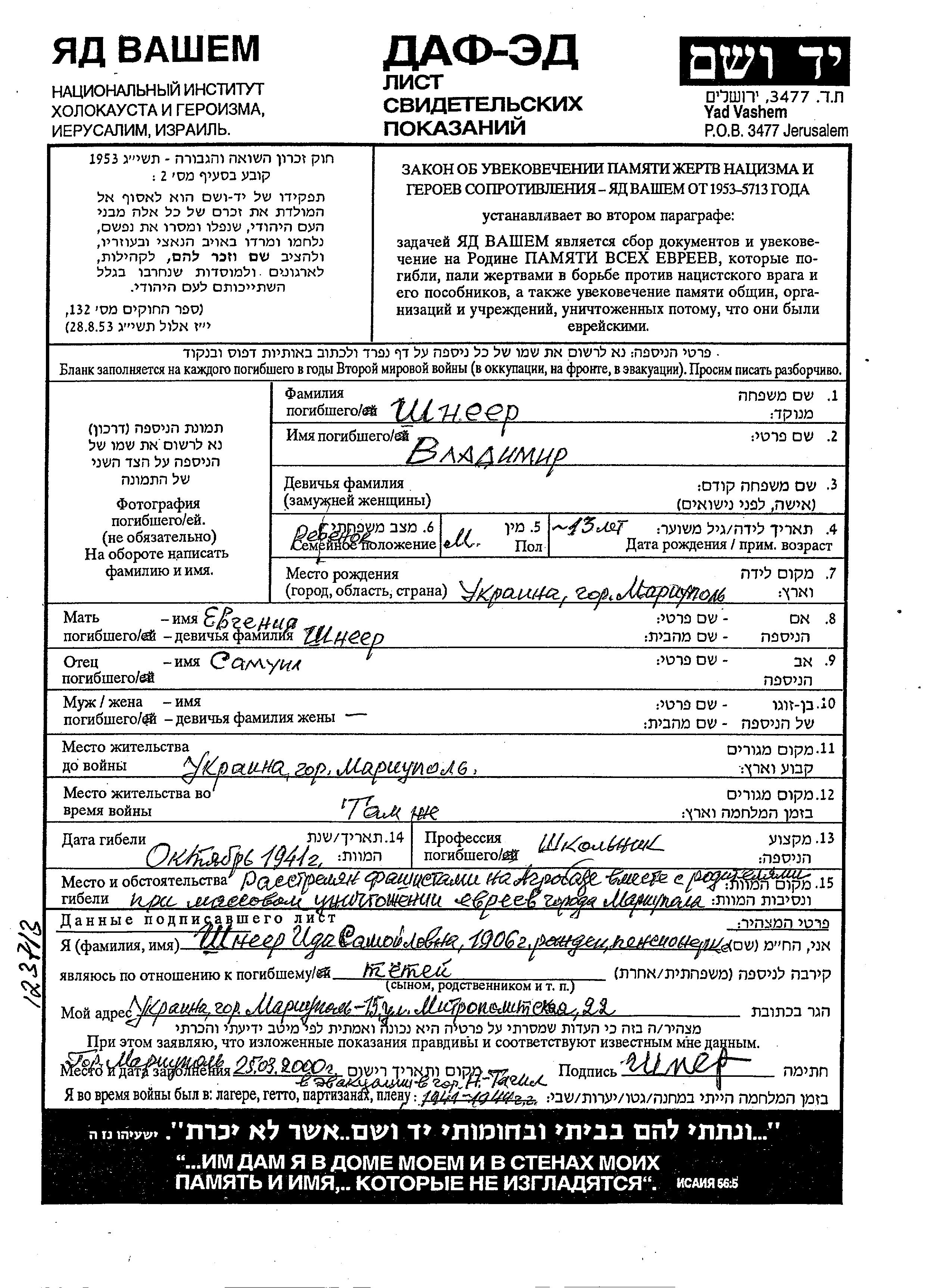 Vladimir wurde in der Schoah ermordet. Todesort: unbekannt im Jahr 10/1941.