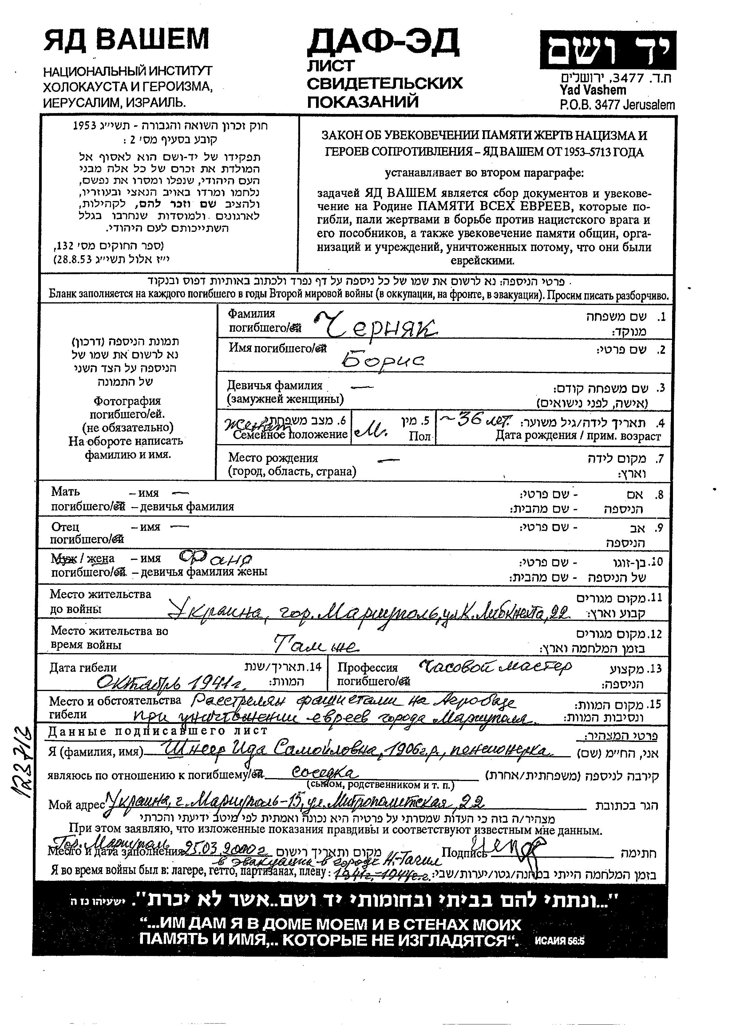 Boris Chernyak. Er war mit Fanya Verheiratet. Vor dem Zweiten Weltkrieg lebte er in Mariupol, Ukraine (UdSSR). Während des Krieges war er in Mariupol, Ukraine (UdSSR).
