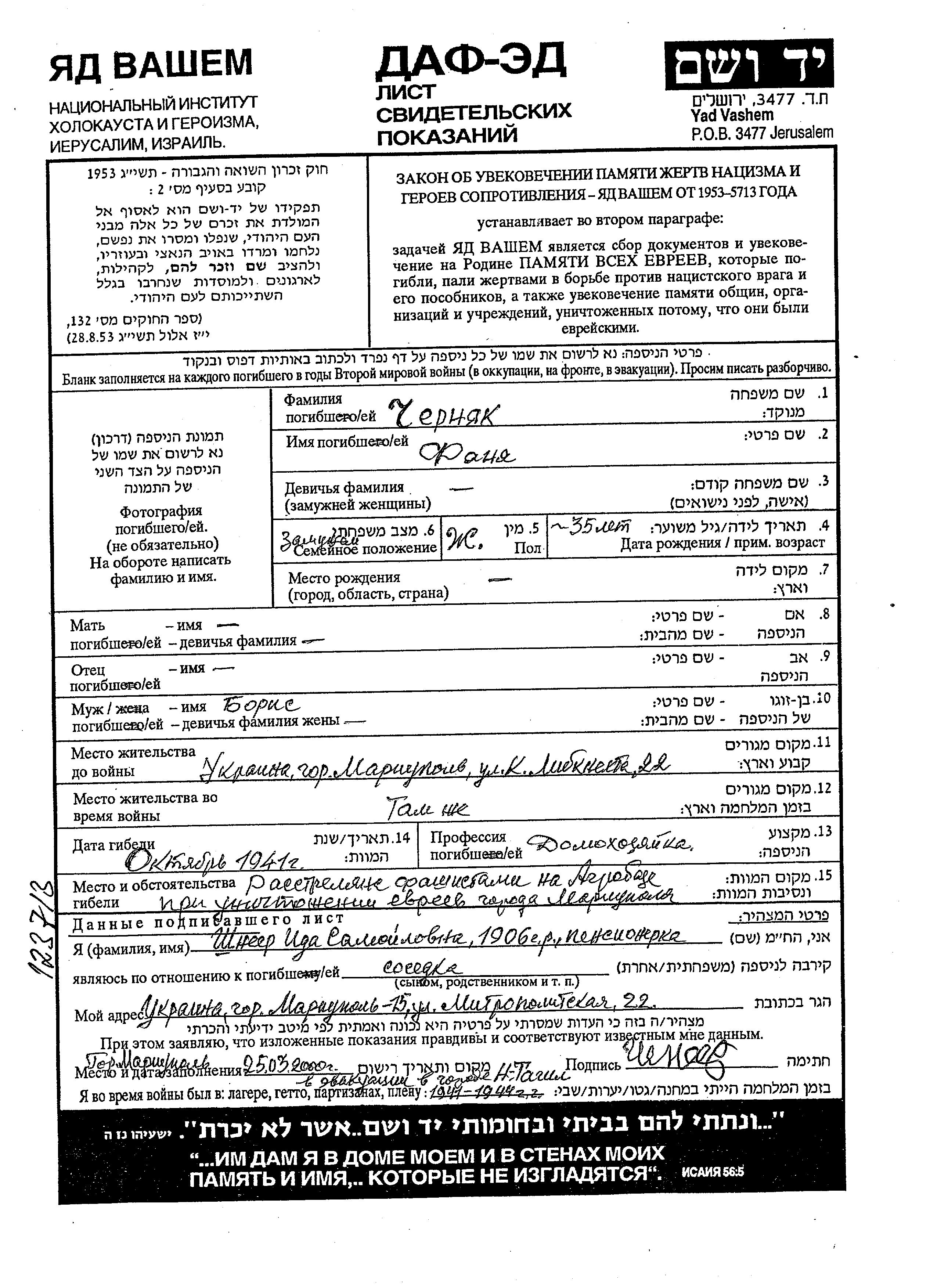 Fanya Chernyak. Sie war mit Boris Verheiratet. Vor dem Zweiten Weltkrieg lebte sie in Mariupol, Ukraine (UdSSR). Während des Krieges war sie in Mariupol, Ukraine (UdSSR).