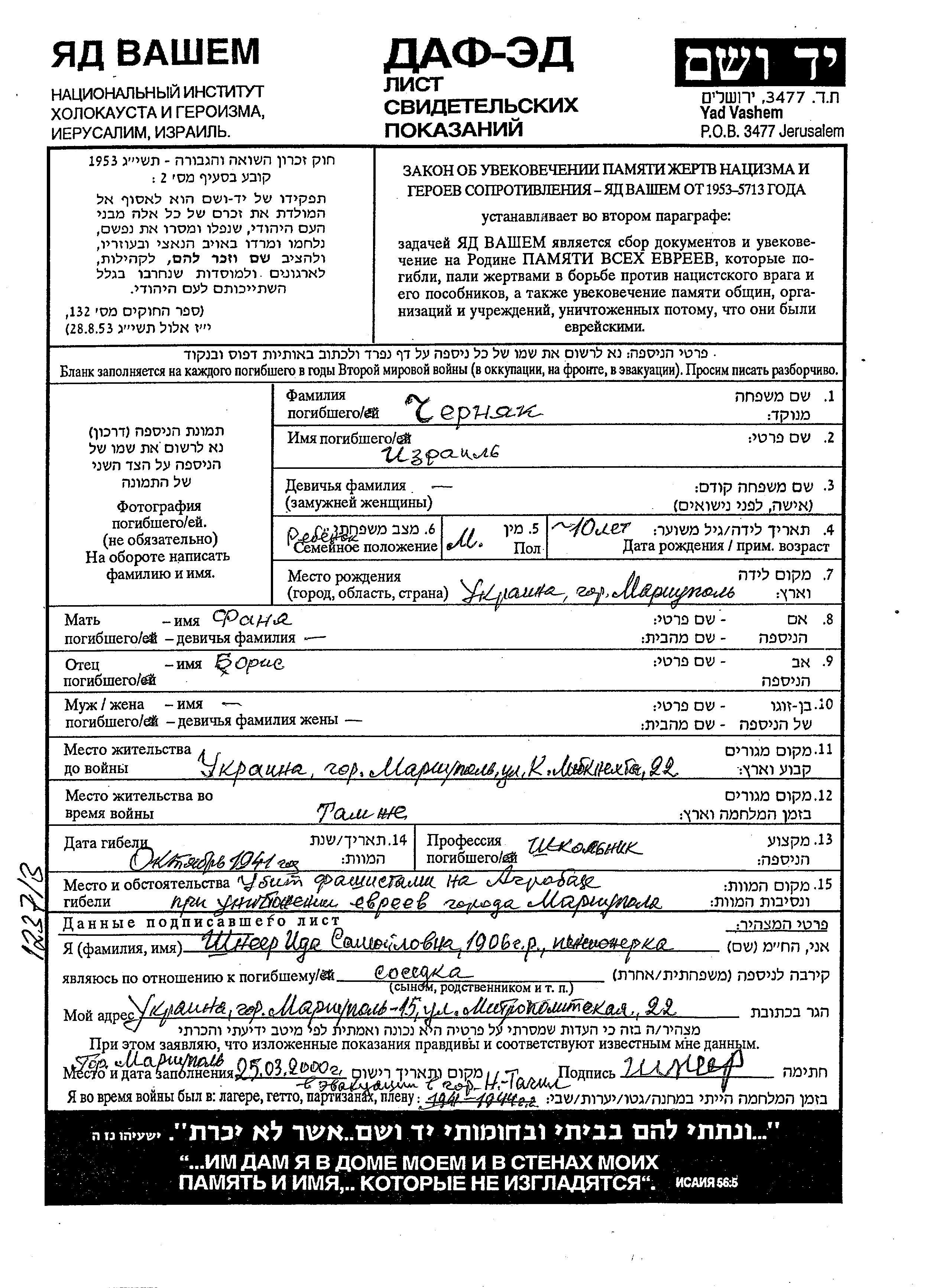 Izrail wurde in der Schoah ermordet. Todesort: Mariupol, Ukraine (UdSSR) im Jahr 10/1941.