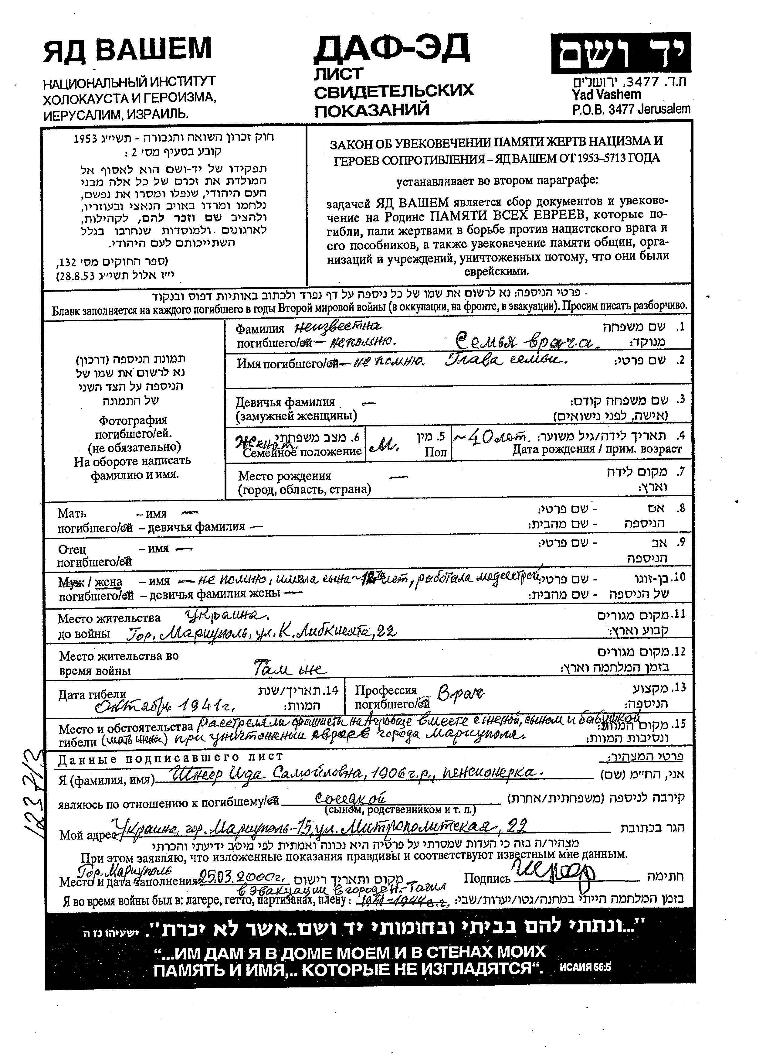 Vorname unbekannt Name unbekannt. Er war Verheiratet. Vor dem Zweiten Weltkrieg lebte er in Mariupol, Ukraine (UdSSR). Während des Krieges war er in Mariupol, Ukraine (UdSSR).