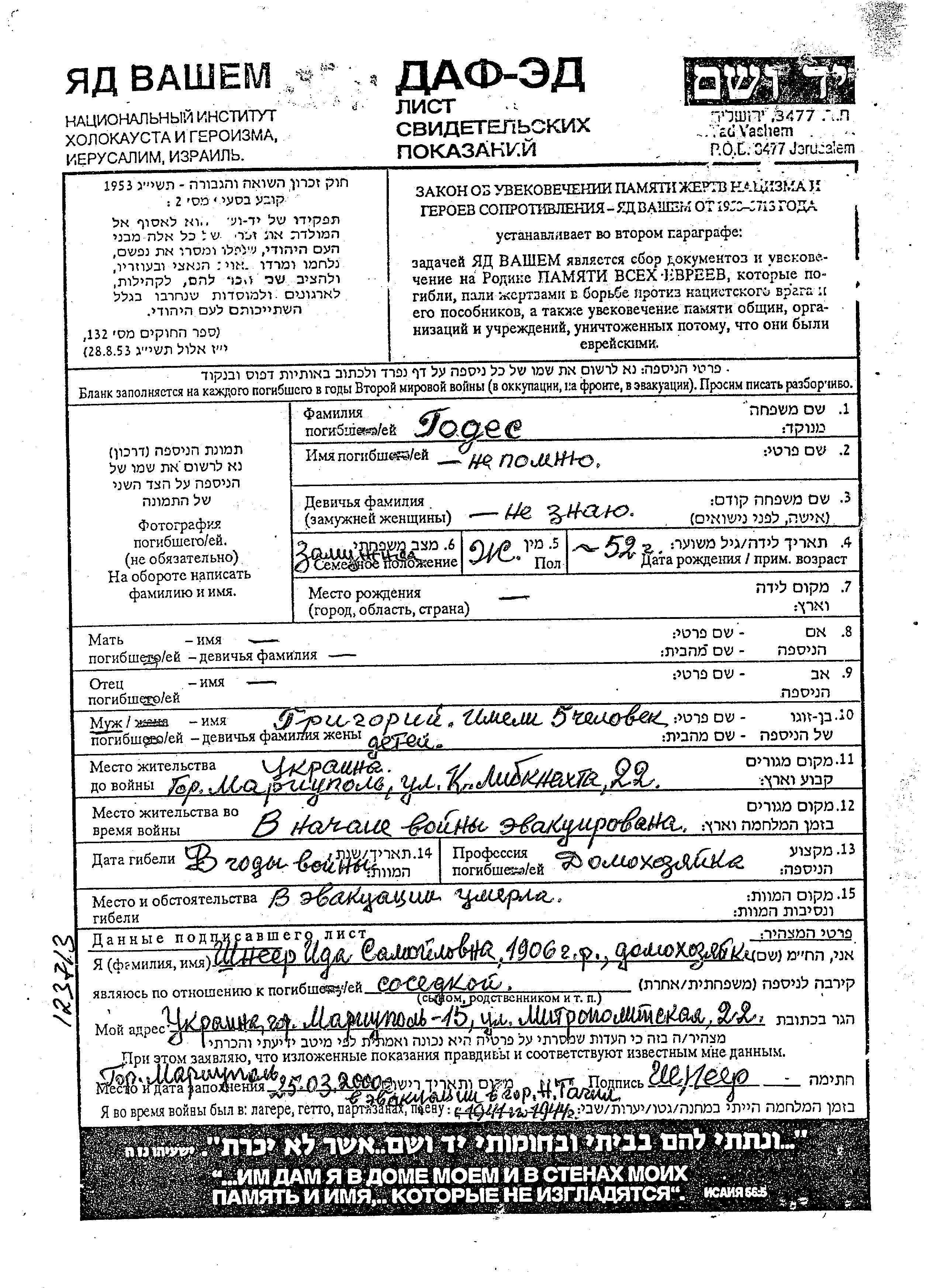 Vorname unbekannt Godes. Sie war mit Grigori Verheiratet. Vor dem Zweiten Weltkrieg lebte sie in Mariupol, Ukraine (UdSSR). Während des Krieges war sie in Mariupol, Ukraine (UdSSR).
