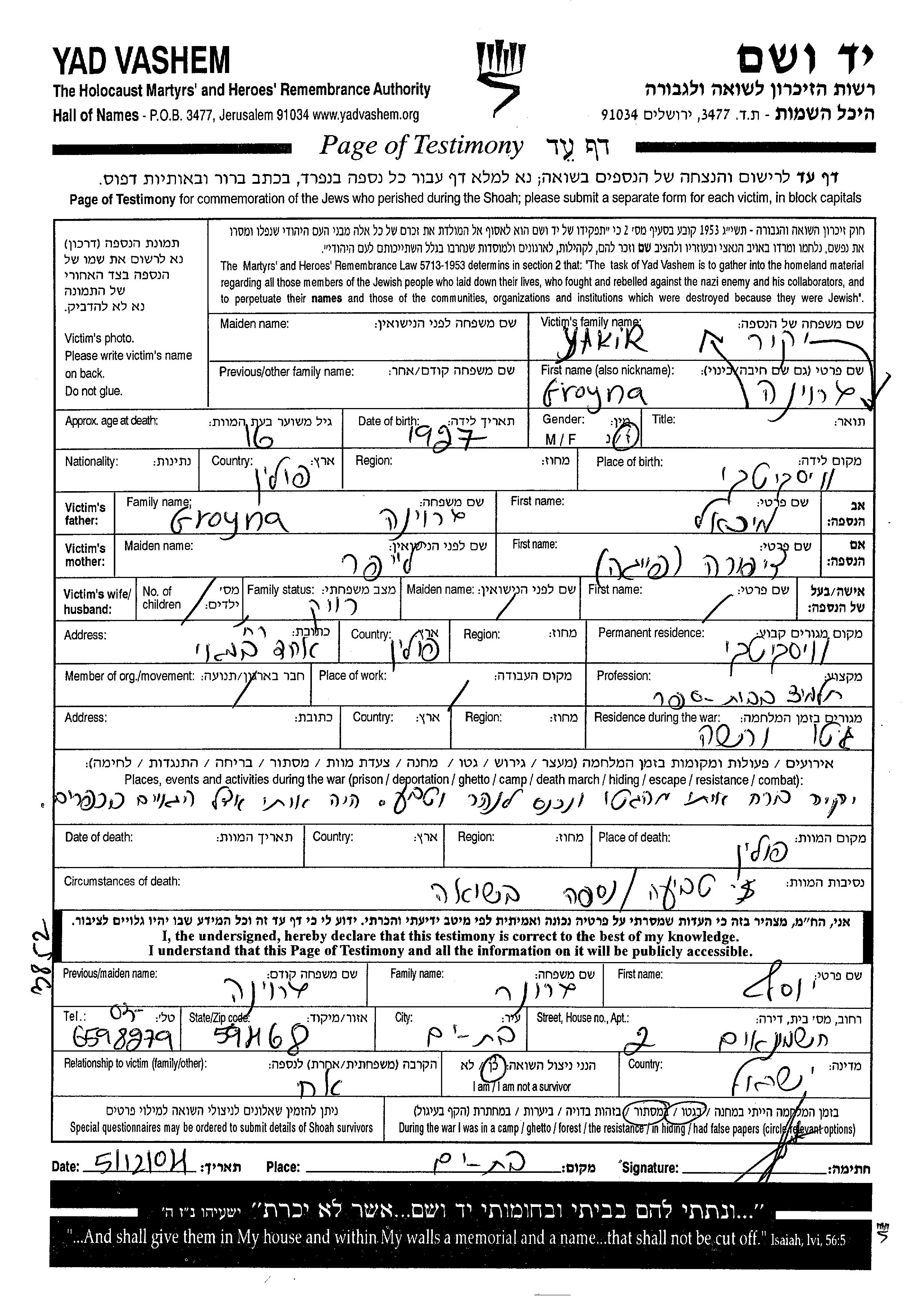 Yakir wurde in der Schoah ermordet. Todesort: Polen.