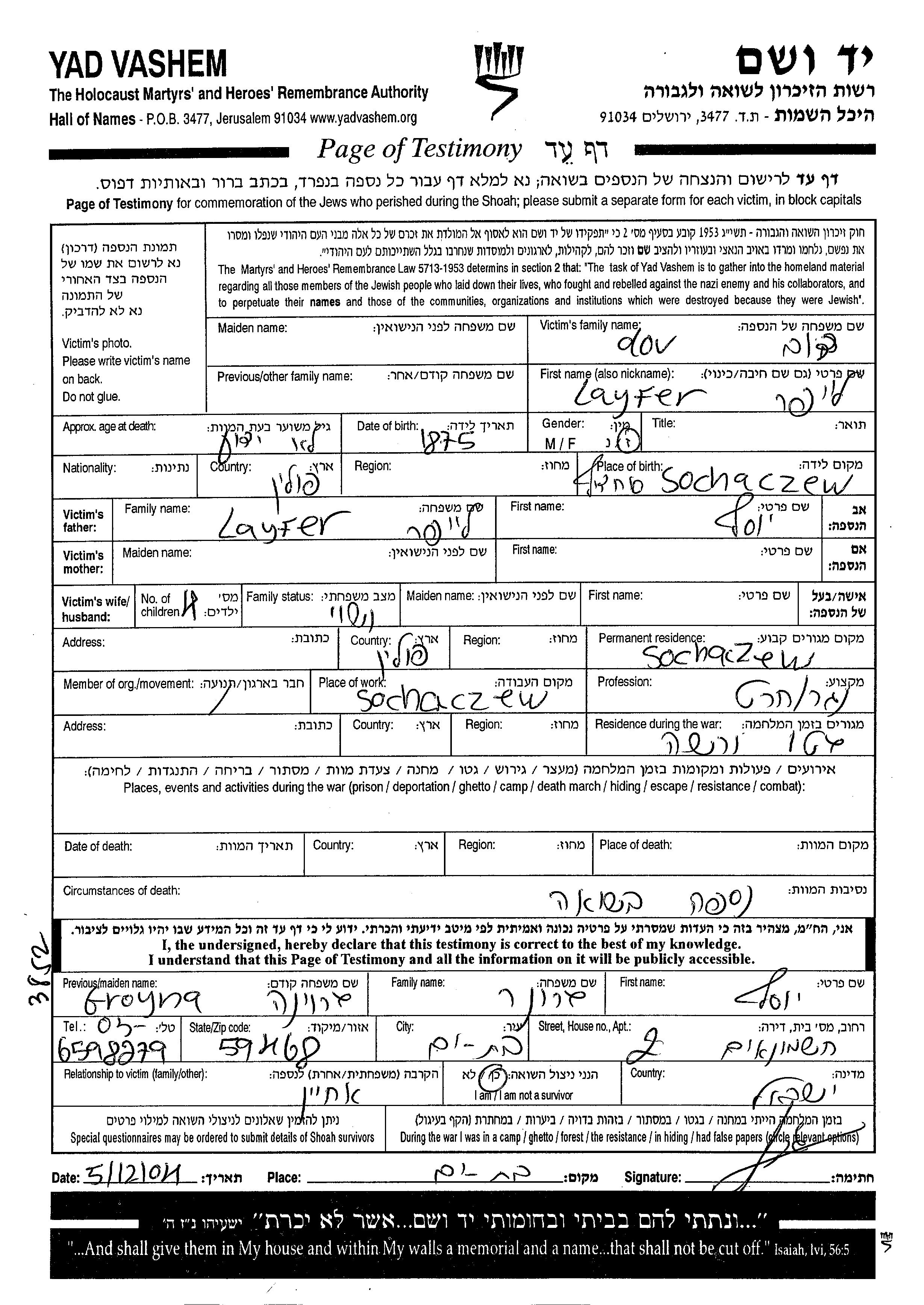 Dov Layfer wurde im Jahr 1875 in Sochaczew, Polen geboren. Er war der Sohn von Yosef. Er war Verheiratet. Vor dem Zweiten Weltkrieg lebte er in Sochaczew, Polen. Während des Krieges war er in Warsaw, Polen.