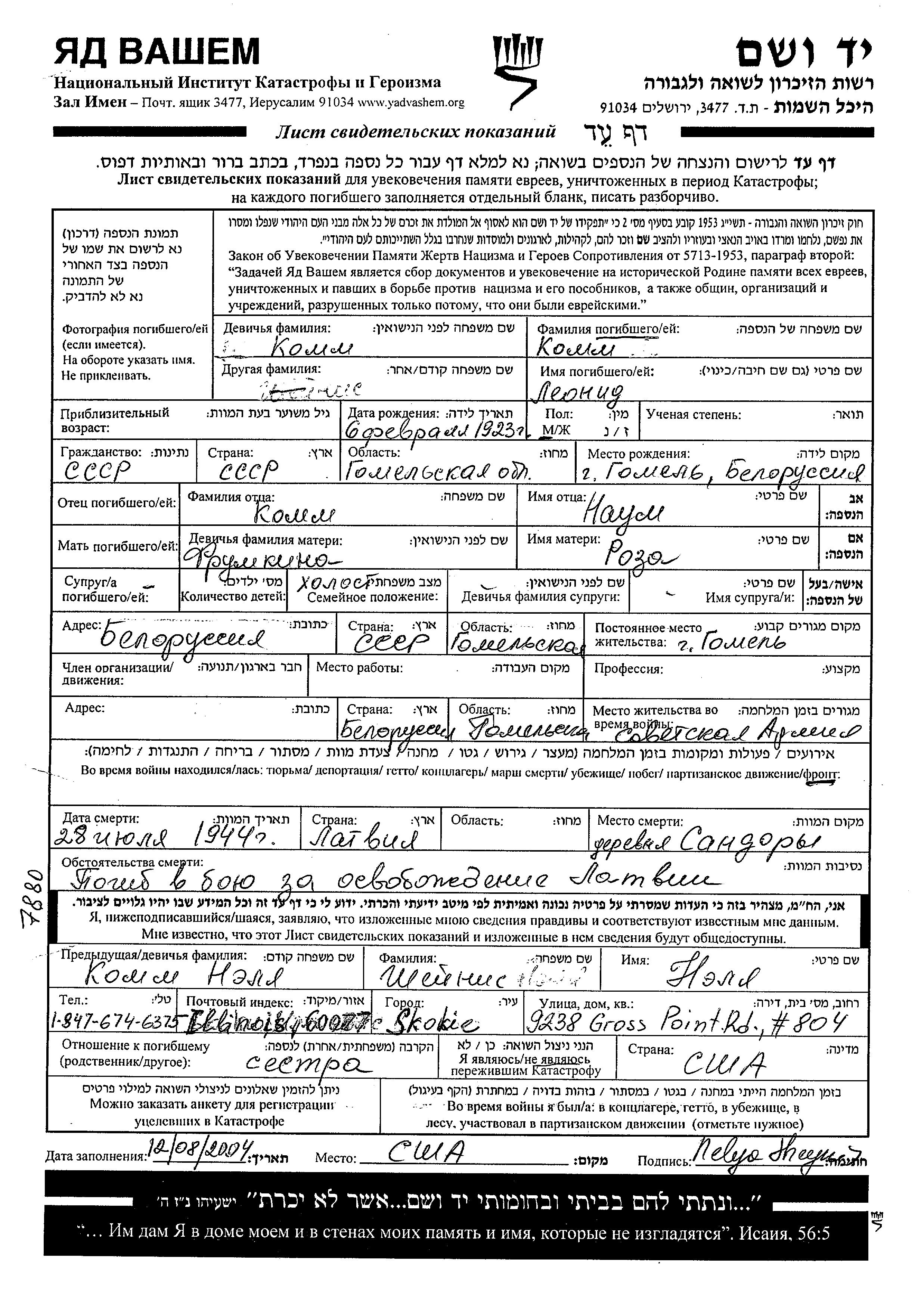Leonid Komm wurde im Jahr 1923 in Gomel, Weißrussland (UdSSR) geboren. Er war der Sohn von Naum und Roza, geb. Frumkina. Er war Ledig. Vor dem Zweiten Weltkrieg lebte er in Gomel, Weißrussland (UdSSR). Während des Krieges war er in die Sowjetischen Streitkräfte.