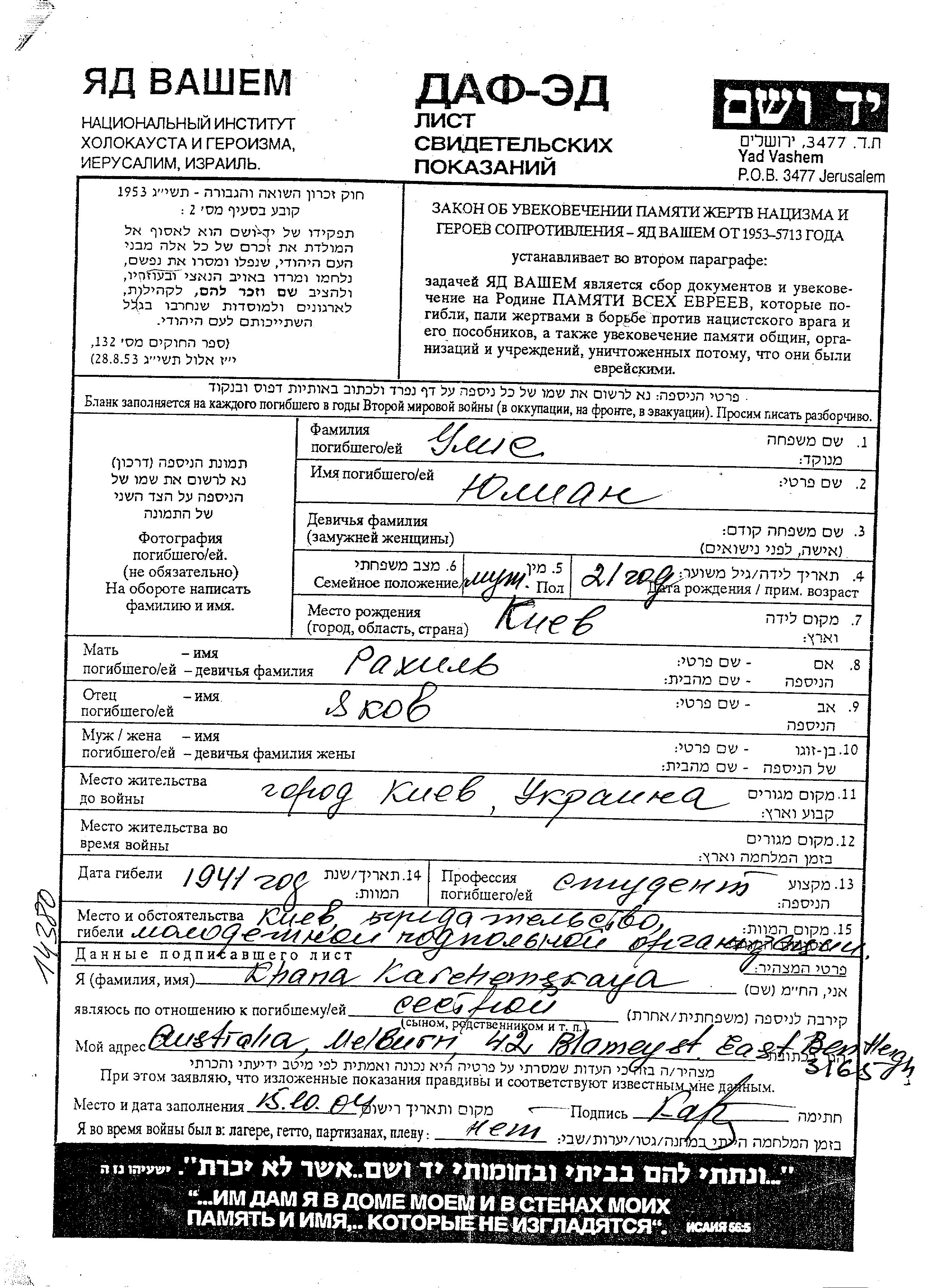 Yulian wurde in der Schoah ermordet. Todesort: Kiev, Ukraine (UdSSR) im Jahr 1941.