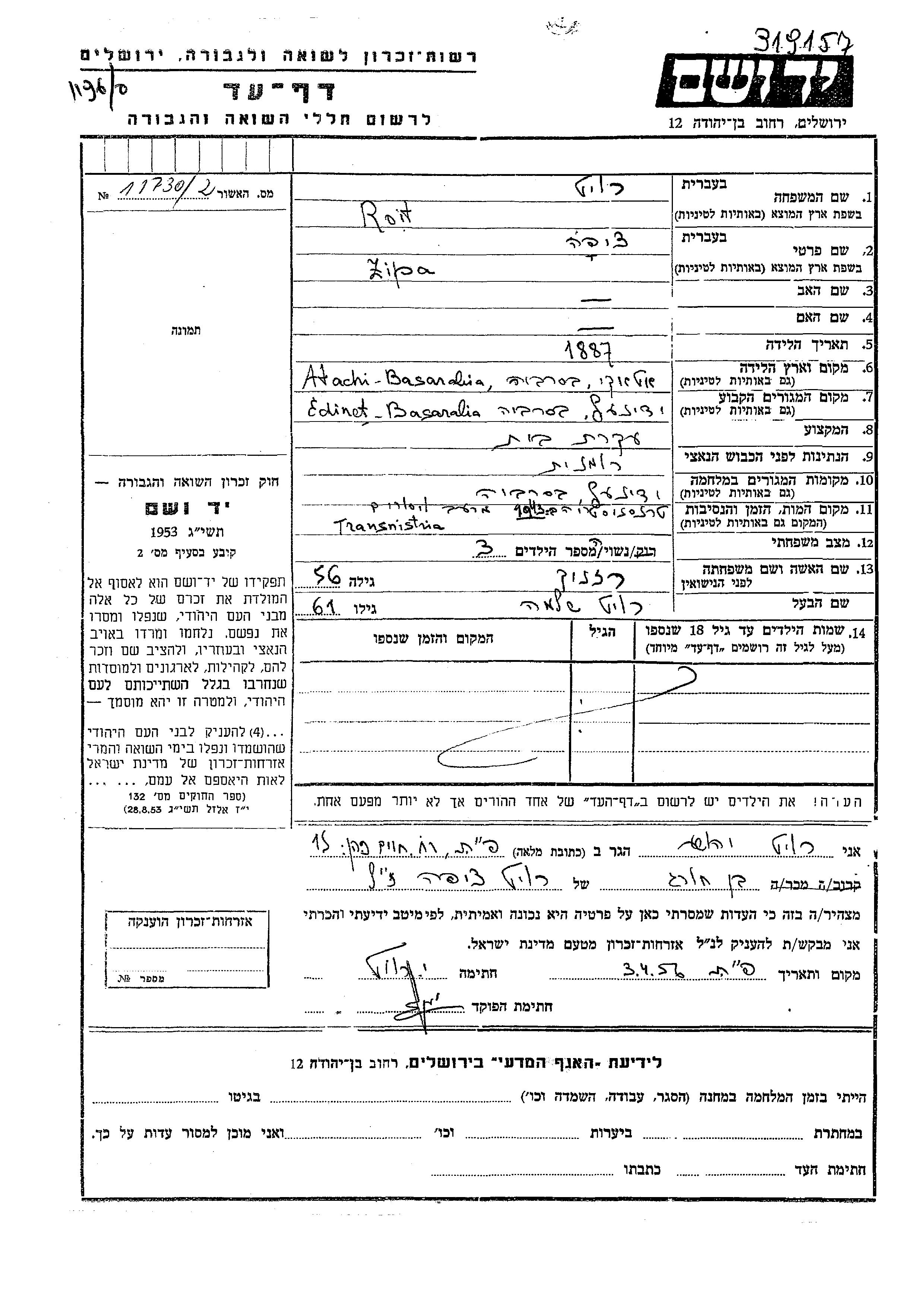 Zipa Roit, geb. Reznik wurde im Jahr 1887 in Atachi, Rumänien geboren. Sie war Hausfrau und mit Shlomo Verheiratet. Vor dem Zweiten Weltkrieg lebte sie in Edineti, Rumänien. Während des Krieges war sie in Edineti, Rumänien.