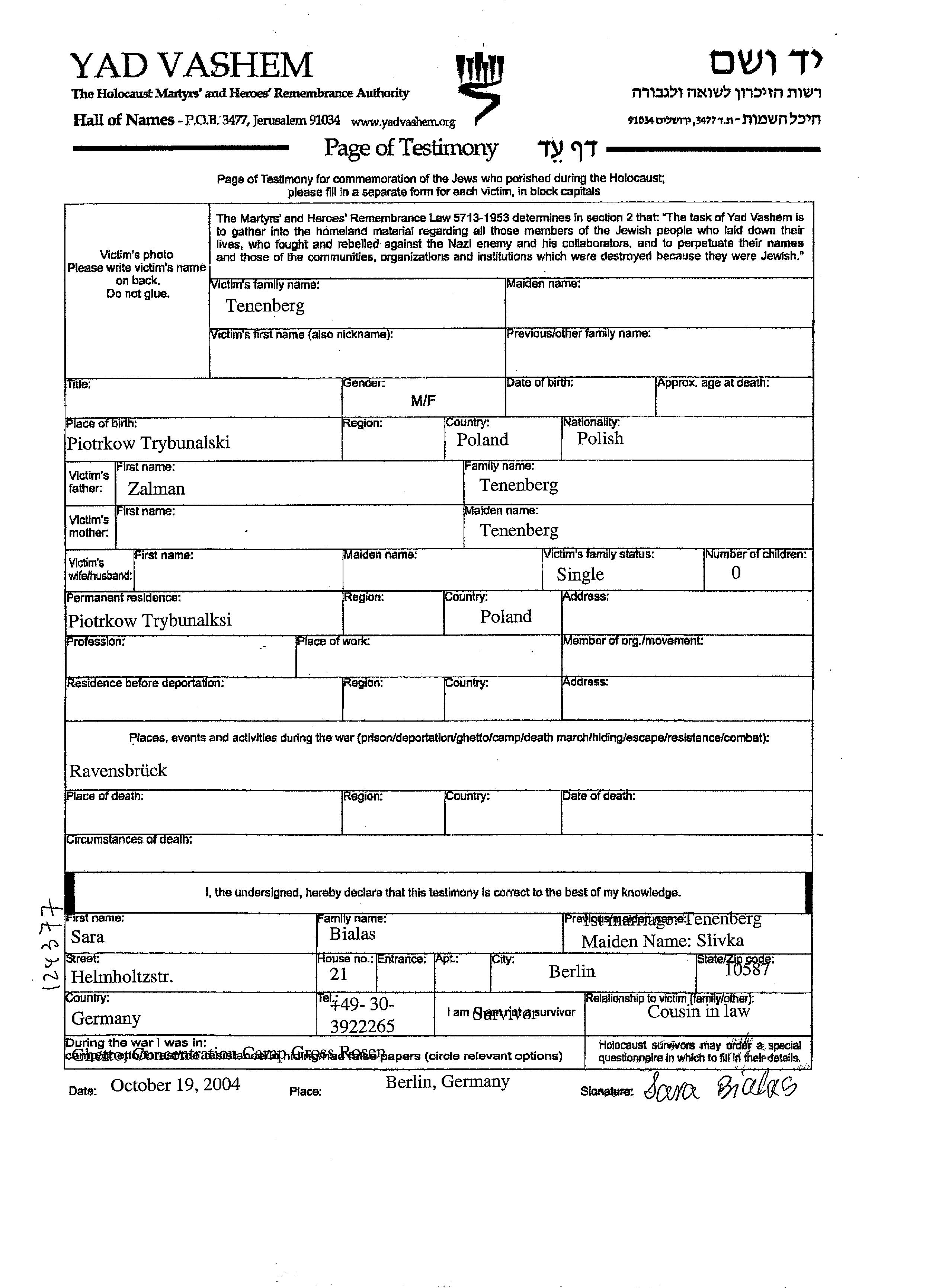 Vorname unbekannt Tenenberg wurde in Piotrkow Trybunalski, Polen geboren. Er/sie war der/ die Sohn/Tochter von Zalman. Er/Sie war Ledig. Vor dem Zweiten Weltkrieg er/sie in Piotrkow Trybunalski, Polen. Während des Krieges war er/sie in Piotrkow Trybunalski, Polen.