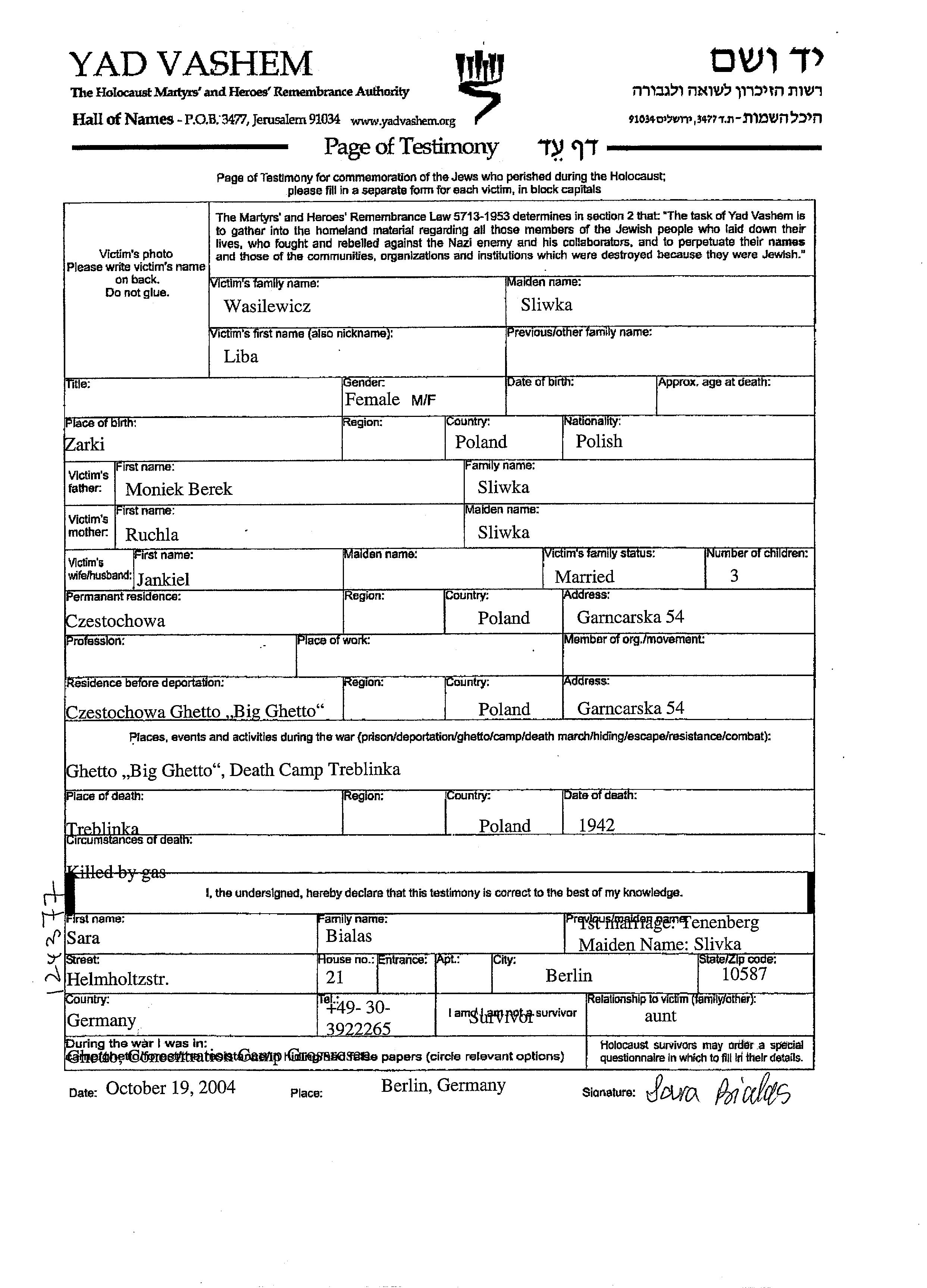 Liba Wasilewicz, geb. Sliwka wurde in Zarki, Polen geboren. Sie war die Tochter von Berek Moniek und Ruchla. Sie war mit Jankiel Verheiratet. Vor dem Zweiten Weltkrieg lebte sie in Czestochowa, Polen. Während des Krieges war sie in Czestochowa, Polen.
