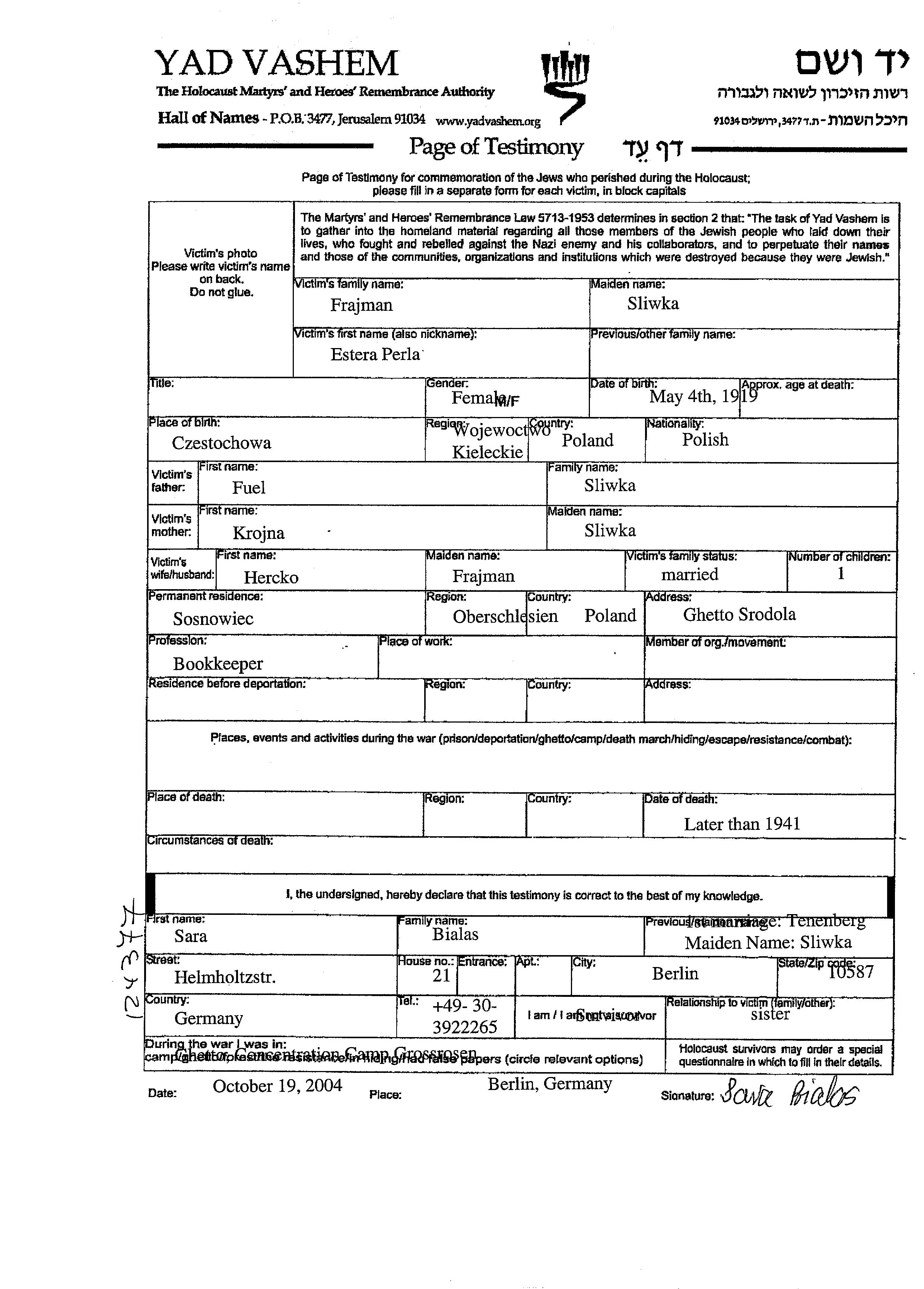 Estera Perla Frajman, geb. Sliwka wurde im Jahr 1919 in Czestochowa, Polen geboren. Sie war die Tochter von Fuel und Krojna. Sie war mit Hercko Verheiratet. Vor dem Zweiten Weltkrieg lebte sie in Sosnowiec, Polen. Während des Krieges war sie in Sosnowiec, Polen.